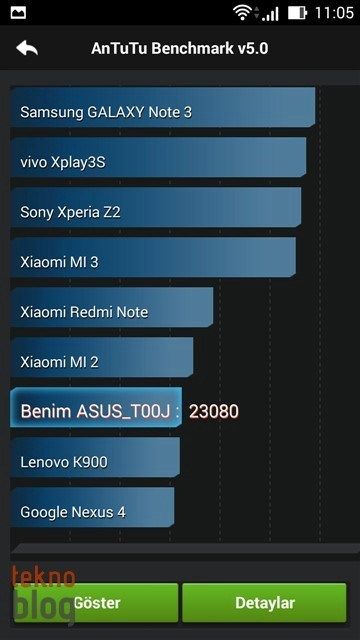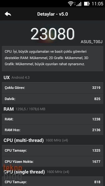 Android cihaz incelemelerimizde başvurduğumuz AnTuTu benchmark testinde de Asus ZenFone 5 elde ettiği 23080 bu telefonun 2012’nin ikinci yarısında çıkmış olan üst sınıf Android telefonlarla aynı seviyede performans sunduğunu gösteriyor. Bu da 699 TL’lik fiyata sahip bir telefon için oldukça iyi görünüyor. Oyun performansı bakımından da ZenFone 5 iyi bir noktada duruyor. Üst sınıf oyunlardan Asphalt 8: Airborne’u takılma olmaksızın ve akıcı grafikler eşliğinde oynamak mümkün. Ancak üst sınıf Android telefonlardakine göre tepkiselliğin biraz geride kaldığını da hissetmedik değil.