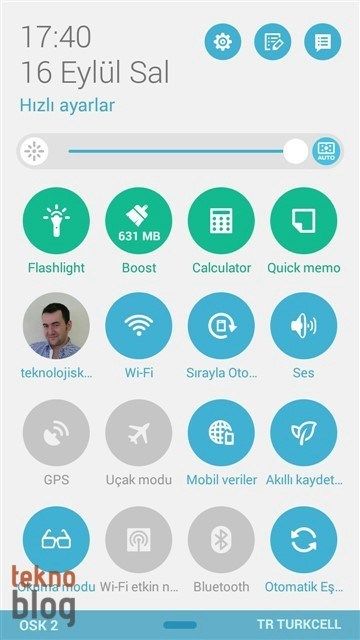 Hızlı ayarlar içinde Wi-Fi, Bluetooth, ses, GPS, mobil veri gibi klasik ayarların yanı sıra flaş ışığı, performans artırıcı, hesap makinesi, Miracast, Eldiven modu gibi özel ayarlar da bulunuyor. Her bir ayar düğmesi yeteri kadar büyük tasarlanmış, böylelikle büyük parmaklarla bile rahatlıkla kullanılıyor.