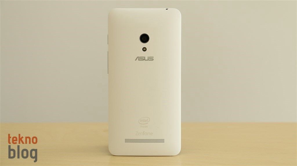 ASUS ZenFone 5’in elimizdeki versiyonunda arka bölümü beyaz plastik kapak örtüyor. Bu kapağın üstünde Asus, Intel ve ZenFone logolarını görüyoruz. 8 megapiksel kamera yatay eksende ortalanmış ve üste doğru konumlanmış. Bunun hemen altında da flaş yer alıyor. Alt kenara doğru da hoparlörün yer aldığını görüyoruz. Arka kapak yerinden rahatlıkla çıkıyor ve sürekli çıkarıp takmalardan sonra bile kapakta oynama olmayacak gibi duruyor. Telefonun 2110 mAh kapasiteli pili görünüyor, ancak gövdeye sabitlenmiş olduğu için kolaylıkla değiştirmek mümkün değil. Pilin hemen üstünde microSIM kart yuvası bulunuyor. ZenFone 5’in çift SIM kartlı versiyonu da bulunuyor, ancak elimizdeki model tek SIM kart desteğine sahip. Üste doğru 64 GB’ye kadar destekli microSD kart yuvası da dikkat çekiyor.