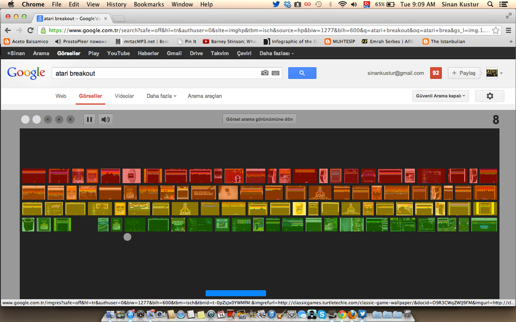 Atari’nin 1976 yılında yayınladığı popüler oyun Breakout’u sevenleri bir sürpriz bekliyor. Google’ın görsel arama ekranına ”atari breakout” kelimelerini yazan kullanıcıların karşısına oyunun tamamen oynanabilir bir versiyonu çıkıyor. Bu versiyonda görüntüler kırılabilir bloklar olarak yeniden düzenlenirken, oyuncular Breakout’u fareyi ya da klavyenin yön tuşlarını kullanarak oynayabiliyor.