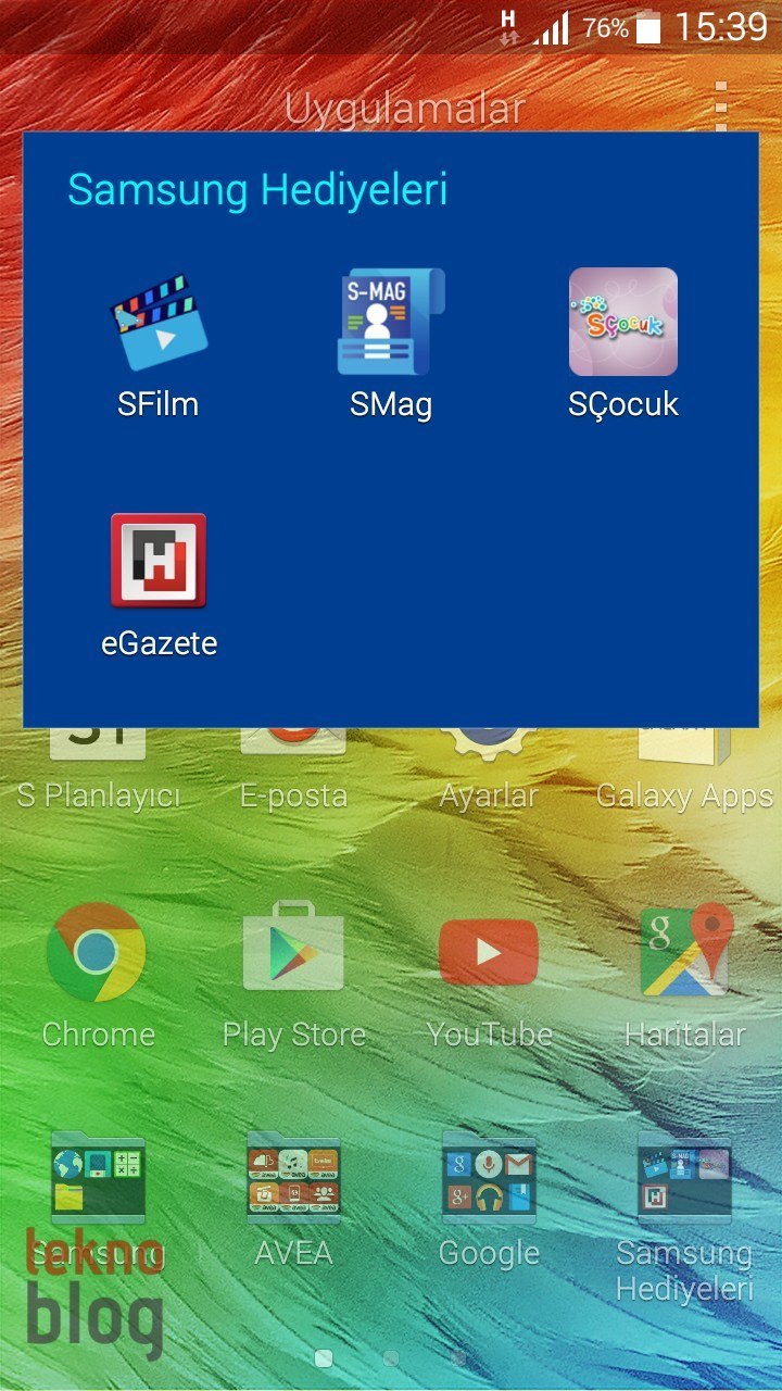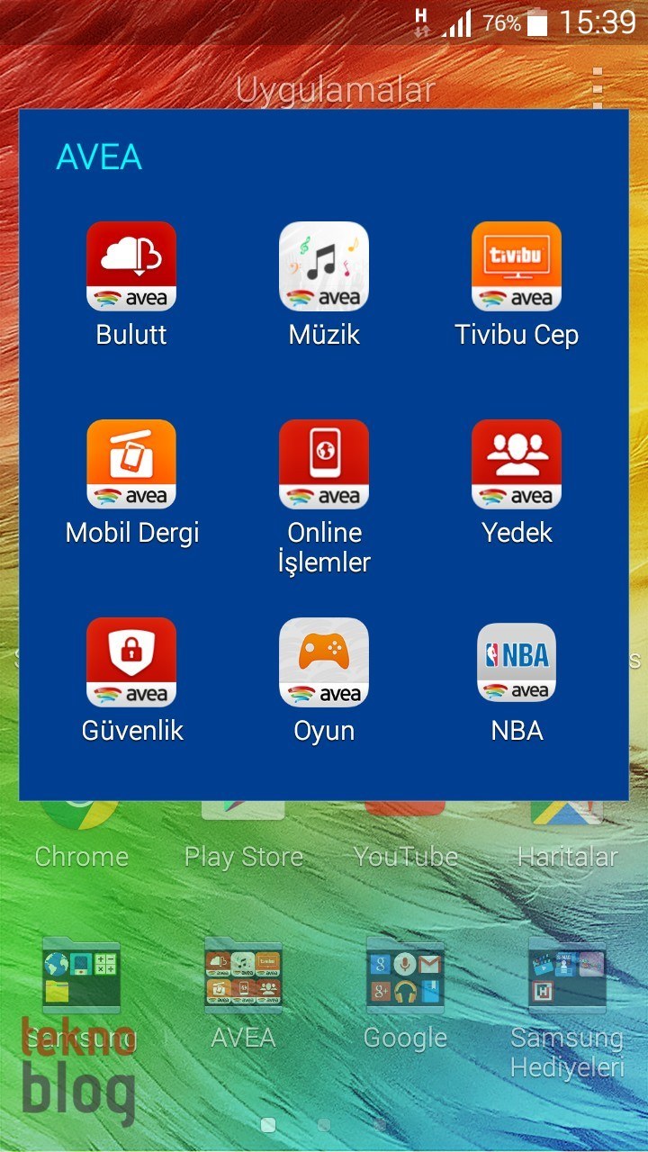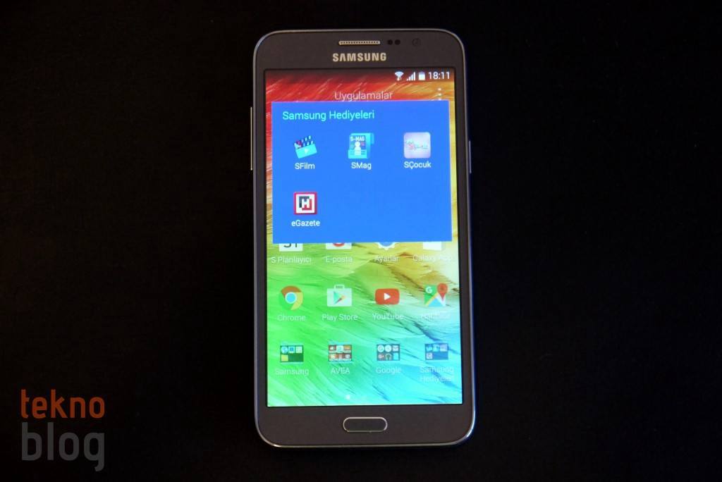 Avea uygulamaları dışında Samsung ve Google’ın yüklü olarak sunduğu çeşitli uygulamalar da mevcut. Örneğin Samsung klasörü altında İnternet, Ses Kaydedici, Hesap Makinesi ve Dosyalarım gibi Avea Galaxy Grand Max için gerekli temel uygulamaları görüyoruz. Samsung Hediyeleri adını taşıyan başka bir klasör altında da SFilm, SMag, SÇocuk gibi Samsung’un Türkiye’ye özel yerel servislerinin uygulamalarını, aynı zamanda Hürriyet eGazete uygulamasını görüyoruz.