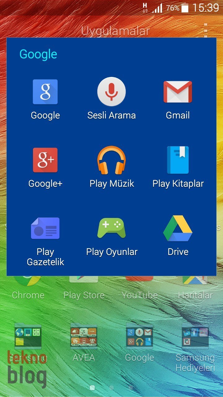 Bir de Avea Galaxy Grand Max’in Google sertifikalı bir Android telefonu olmasından süregelen Google uygulamaları var. Google, Sesli Arama, Gmail, Google+, Play Müzik, Play Kitaplar, Play Oyunlar, Drive gibi Google servislerine ait uygulamaları Google klasörü altında görüyoruz. Ayrıca Google uygulamalarının kısayollarını barındıran bir uygulama klasörü ana ekranda da bulunuyor.
