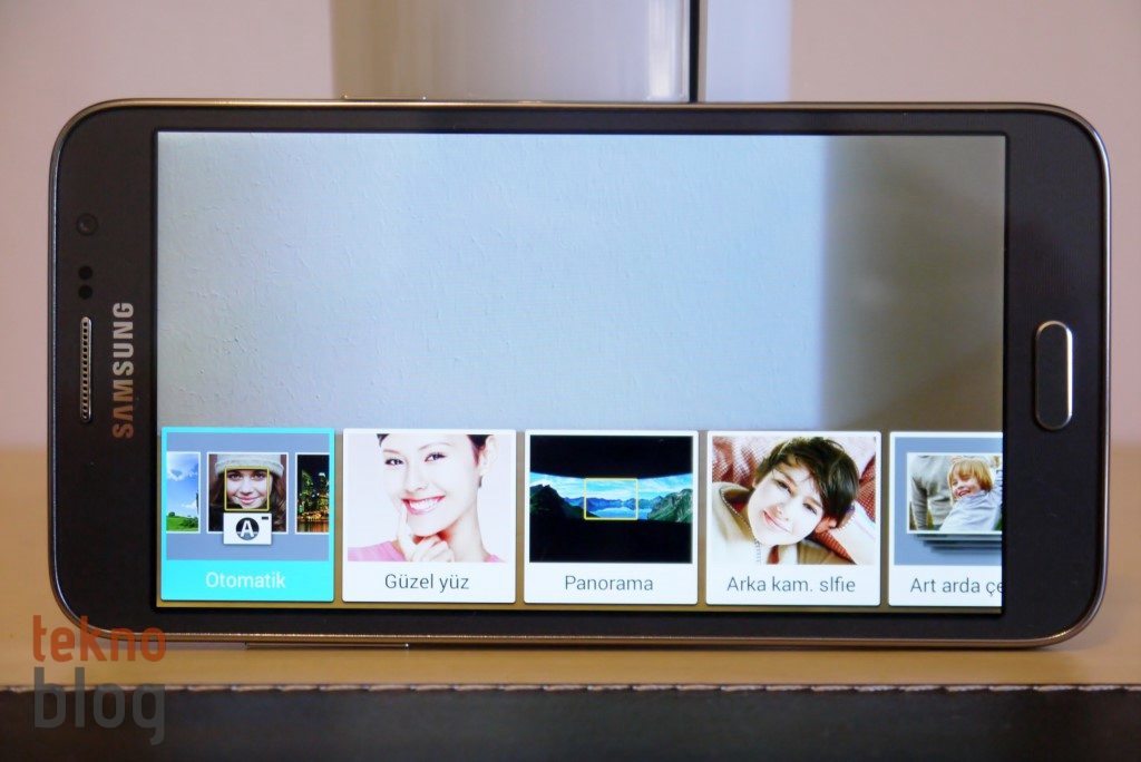 Avea Galaxy Grand Max’in kamera uygulamasına baktığımızda, 2014 model Samsung telefonlarında, ya da diğer bir deyişle KitKat yüklü Samsung Galaxy telefonlarında gördüğümüz kamera uygulamasını görüyoruz. Bu uygulama kolay kullanılabilir, anlaşılır bir arayüze sahip. Sağ kenarda fotoğraf ve video çekim tuşlarının yer aldığını görüyoruz. Bunların yanına bir de mod seçim tuşu eklenmiş. Otomatik, Güzel yüz, Panorama, Arka kamera selfie, Art arda çoklu çekim, HDR gibi çekim modlarını görüyoruz. Bir de Animasyonlu GIF modu var ki, onunla eğlenceli animasyonlar oluşturabilirsiniz.