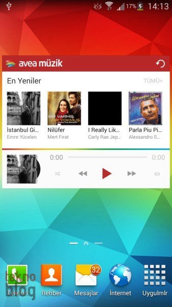 Telefonun açılışında Avea logosu ve animasyonu dikkat çekerken kilit ekranında da Avea logosunun bulunduğunu görüyoruz. Öte yandan Avea’nın logosunun renklerini andıran gökkuşağı renklerinin tonlarını içeren bir duvar kağıdı da mevcut. Ve tabii ki Avea uygulamaları… Avea’nın Mobil Dergi, Online İşlemleri, Tivibu Cep, Seyahat, Müzik gibi uygulamaları Galaxy Grand 2 LTE’de yüklü olarak geliyor. Bu uygulamaların kısayolları ana ekrana yerleştirildiği gibi, uygulama menüsü içinde yer alan Avea klasörü içinden de bu uygulamalara erişmek mümkün oluyor.