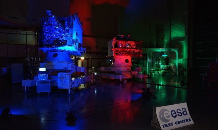 Avrupa Uzay Ajansı, BepiColombo’da kullanılacak araçların işlevleri konusunda da bilgi verdi. Yukarıdaki fotoğrafta mavi ışığın altında görülen yörünge aracı, Merkür’ün yüzeyini ve iç kompozisyonunu inceleyecek. Kırmızı ışık altındaki Merkür Transfer Modülü ise yörünge araçlarını hedeflerine taşıyacak.