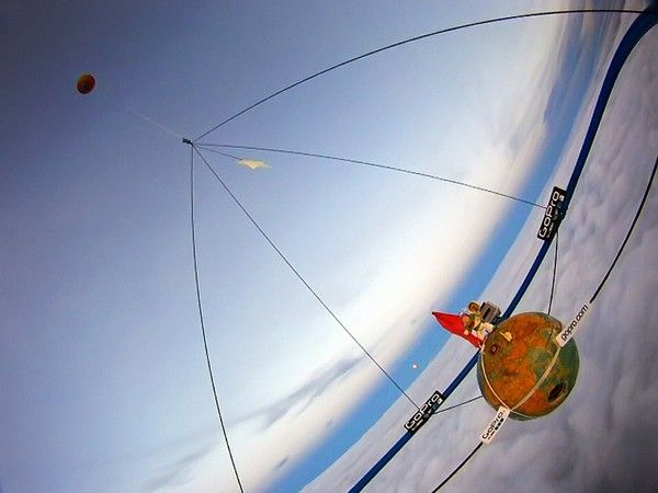 Yukarıdaki fotoğrafta gördüğünüz küre 15 Haziranda atmosfere çıktı. Bir balona bağlı olan bu kürenin üzerinden GPS / GSM izleyici, iki adet GoPro kamera, iki adet Canon kamera ve bir adet de Buzz Işık Yılı figürü bulunuyor.