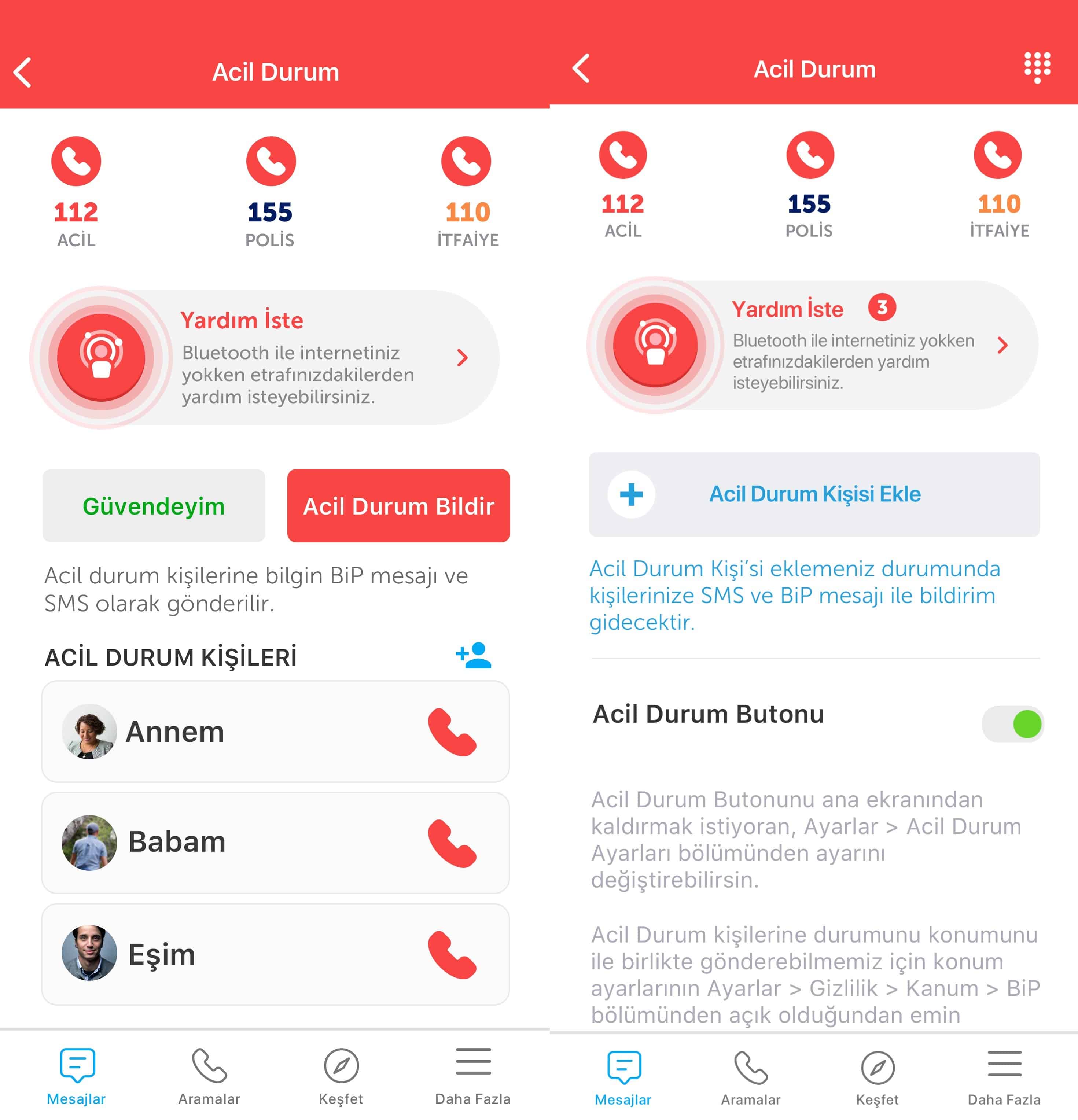 Türk mühendislerinin deprem ve diğer doğal afetler ile acil durumlarda hızlı, kolay ve kesintisiz iletişim imkânı sunmak için geliştirdiği ‘Acil Durum Butonu’, tüm operatör kullanıcılarının daha önce belirlemiş olduğu yakınlarına tek tuşla güvende ya da acil yardıma muhtaç olduklarını konumlarıyla birlikte hem BiP hem de SMS ile iletmelerini sağlıyor. Aralık 2019’dan bu yana BiP ‘Acil Durum Butonu’ ile “Acil Durumda Ulaşılacak Kişi” sayısı ise 2 milyona ulaştı. Kullanıcılar Acil Durum Butonu ile ayrıca 112 Acil Servis, 155 Polis ve 184 SABİM’e de direkt erişebiliyor.