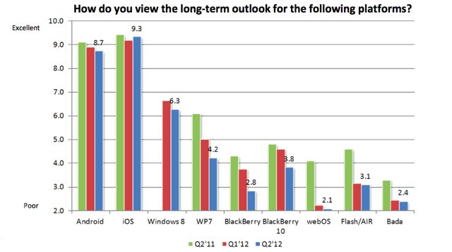 Baird Equity Research tarafından düzenlenen ve geliştiricilerin işletim sistemlerine olan ilgisini ölçen araştırmada, BlackBerry 10’a olan geliştirici ilgisinin %17 oranında azaldığı ve 10 puan üstünden yapılan değerlendirmede 4.6’dan 3.8’e düştüğü görüldü. BlackBerry 10’un geliştirici ilgisi açısından geride bırakabildiği işletim sistemleri ise BlackBerry’lerdeki mevcut işletim sistemi BlackBerry 7, Adobe’un Flash/Air’i, Samsung’un Bada platformu ve açık kaynaklı webOS oldu.