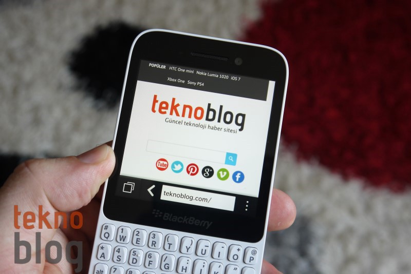 BlackBerry Q5’in dahili internet tarayıcısının performansıysa incelenebilir durumda. Diğer Teknoblog incelemelerinde de başvrulan SunSpider Benchmark testinde bu tarayıcı 1780.1 ms +/- 2.8% gibi bir sonuç elde etti. Bu testte hem iPhone’un Safarisi hem de Windows Phone cihazlarında yüklü gelen IE10 1000 ms?nin altına inmeyi başarıyor. Karşılaştırma yapıldığında Q5’in elde ettiği sonuç biraz sönük kalsa da, pratikteki durum rakamların her şey olmadığını gösteriyor. Masaüstü web sitelerini kabul edilebilir bir hızda açan internet tarayıcısı, Adobe Flash desteği de barındırıyor. Ancak Flash içeriğinin çok fazla olduğu sitelerde bu desteği etkinleştirmek biraz tıkanıklığa yol açabiliyor.