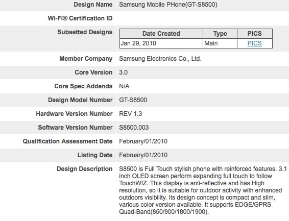 Başvuru kayıtlarında Samsung GT-S8500 olarak adlandırılan bu model ince ve kompakt tasarıma sahip. 3.1 inç’lik, yüksek çözünürlüklü, dokunmatik OLED ekran barındıran telefonda TouchWiz arayüzü ve dört bant GSM/EDGE desteği bulunuyor. Bluetooth 3.0 teknolojisi 24 Mbps’ye varan hızlarda veri transferi yapma olanağı sağlarken güçten de tasarruf etmemize ön ayak olacak. Her iki yenilik de modern multimedya cihazlarının avantajına işleyecek. Her ne kadar telefonun ne zaman lanse edileceği belirtilmese de, önümüzde Mobil Dünya Kongresi var, buralarda birşey çıkacaktır.
