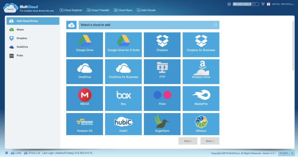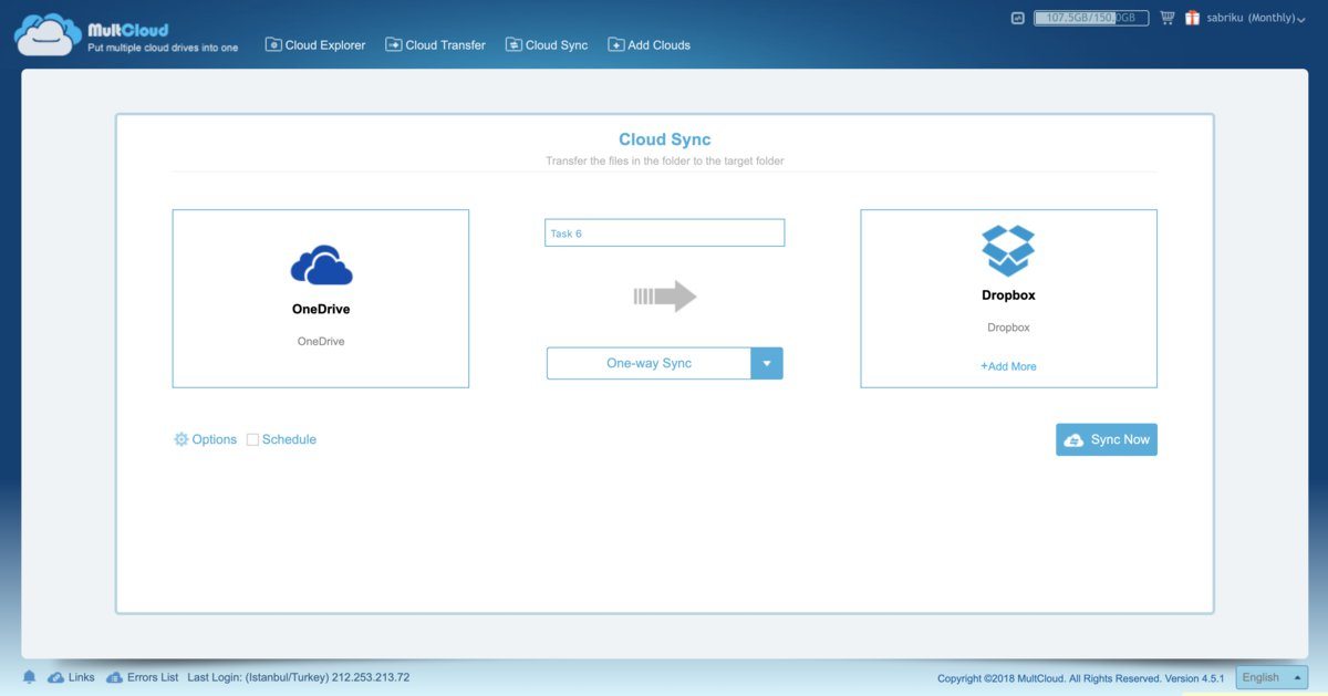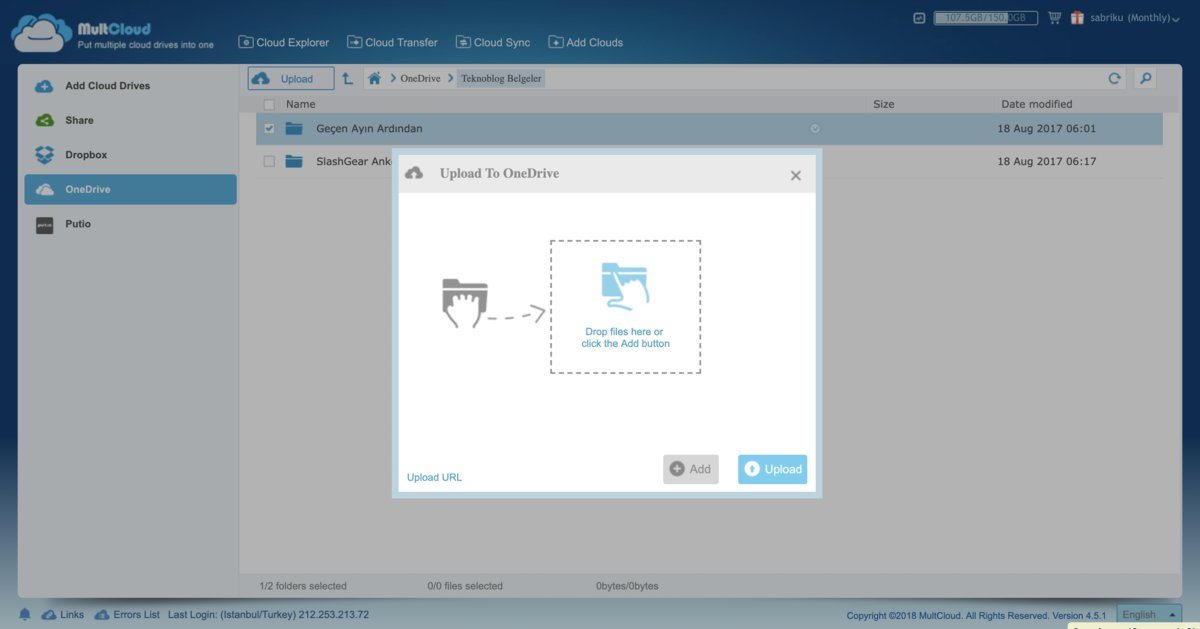 Sadece bir kereliğine kullanacağım için, aylık 10 dolar ücret ödeyerek paralı servisi satın almakta sakınca görmedim. Amacım Dropbox ve put.io’yu kapatmak olduğundan, buralarda tuttuğum ve önemli gördüğüm bazı dosyaları, Office 365 aboneliğim nedeniyle açık tutmaya devam edeceğim OneDrive’a taşımaktı. Bu üç bulut depolama servisini de Multcloud hesabıma ekledim. Daha sonra da taşıma işlemini gayet sade ve anlaşılır kullanıcı arayüzü sayesinde hallettim.