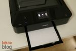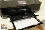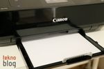 Kontrollerin altına doğru ilerlediğimizde, ön panelin katlanarak açıldığını ve kağıt çıkışına imkan tanıdığını görüyoruz. Bu panelin hemen altında iki adet kağıt yuvası bulunuyor, bunlardan biri 13 x 18 cm’lik fotoğraf kağıtları, diğeri de A4 kağıtlar için kullanılıyor. Tabii ki, PIXMA MG7550 bunların dışında da bazı kağıt boyutlarını destekliyor. A4 boyutlu kağıtlara özel tepsiye 125 adet düz beyaz kağıt konulabilirken, diğer tepsi 20 adet fotoğraf kağıdını alabiliyor. Akıllı düzenleme mekanizmasına sahip olan bu tepsilerin bir tanesinde CD/DVD üstüne baskı yapmayı sağlayan özel bir yuva da bulunuyor.