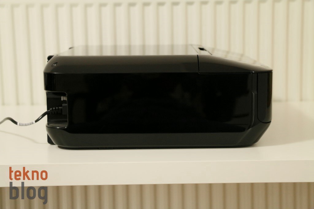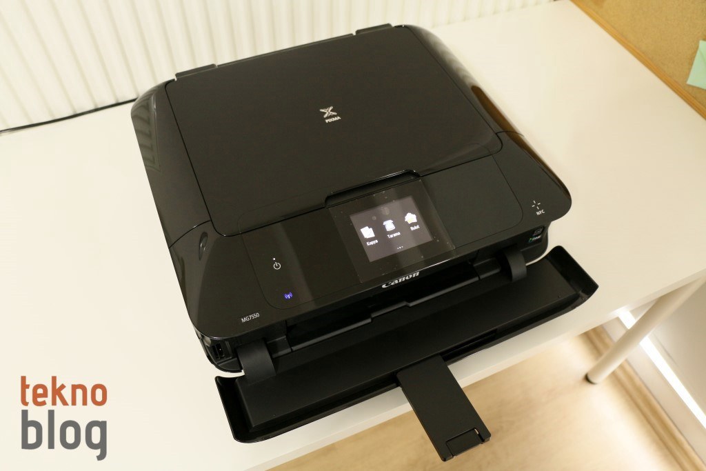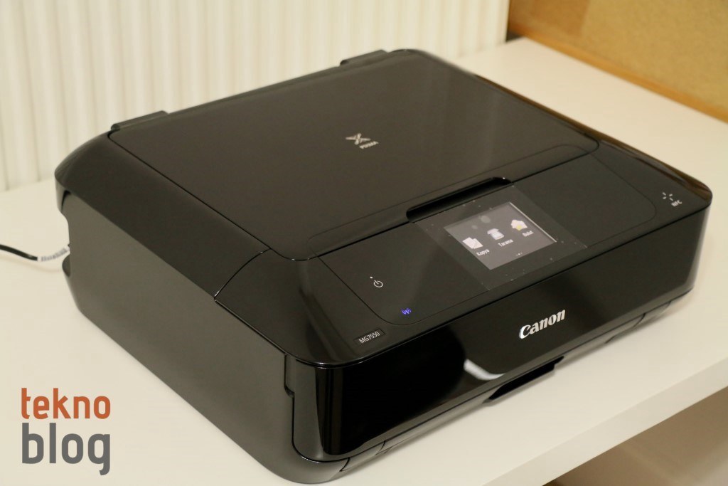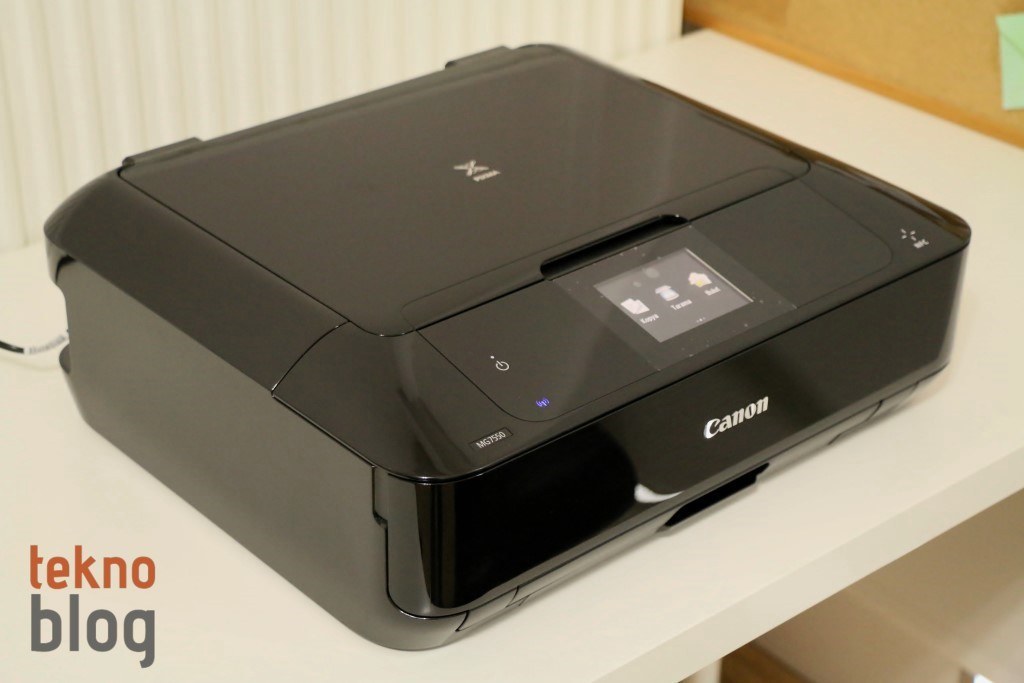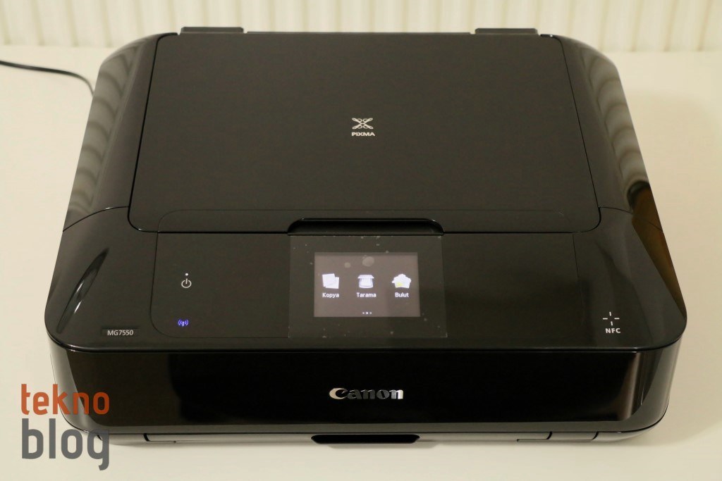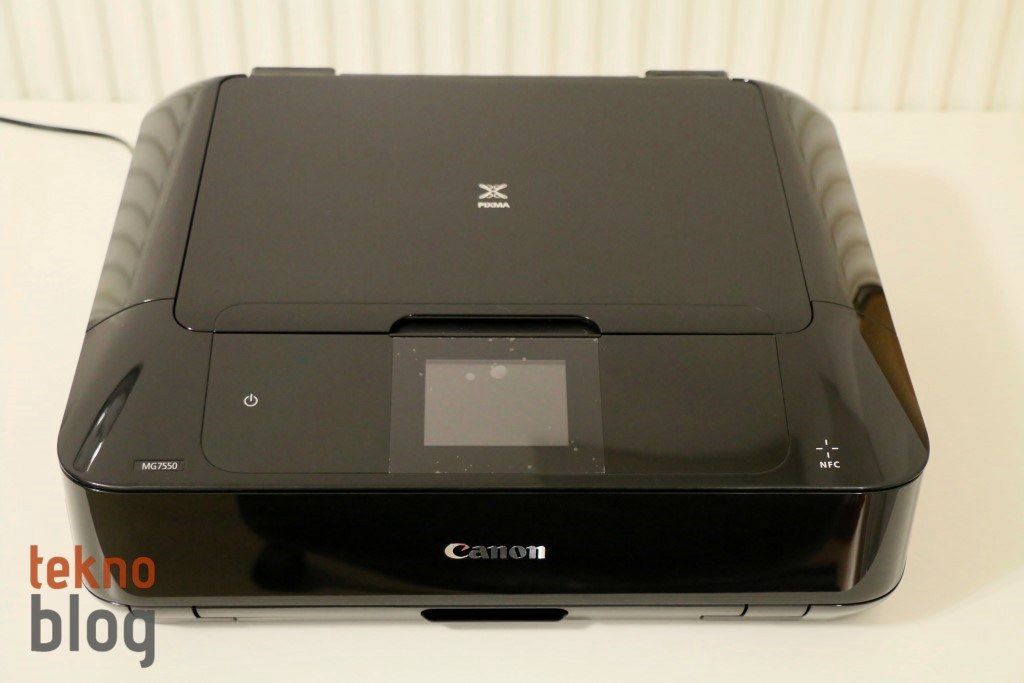 Siyah, beyaz ve bunlara ek olarak yanık turuncu gibi sıra dışı bir renge sahip olan Canon PIXMA MG7550 birkaç yılın öncesine ait PIXMA her şey dahil çözümlerinin vernik boyalı kutu tasarımını temel alarak geliştirilmiş. Eğimli ön panel daha önceki modellerde üst bölümü tamamen kaplayan tarayıcı kapağının bir kısmını işgal ediyor, ancak 8.8 cm’lik dokunmatik ekran ve birkaç tane özel buton için yeterli alanın var olmasına imkan tanıyor. Dokunmatik ekranın sağına ve soluna yerleştirilmiş olan kapasitif dokunmatik butonlar aydınlatma özelliğine de sahip.