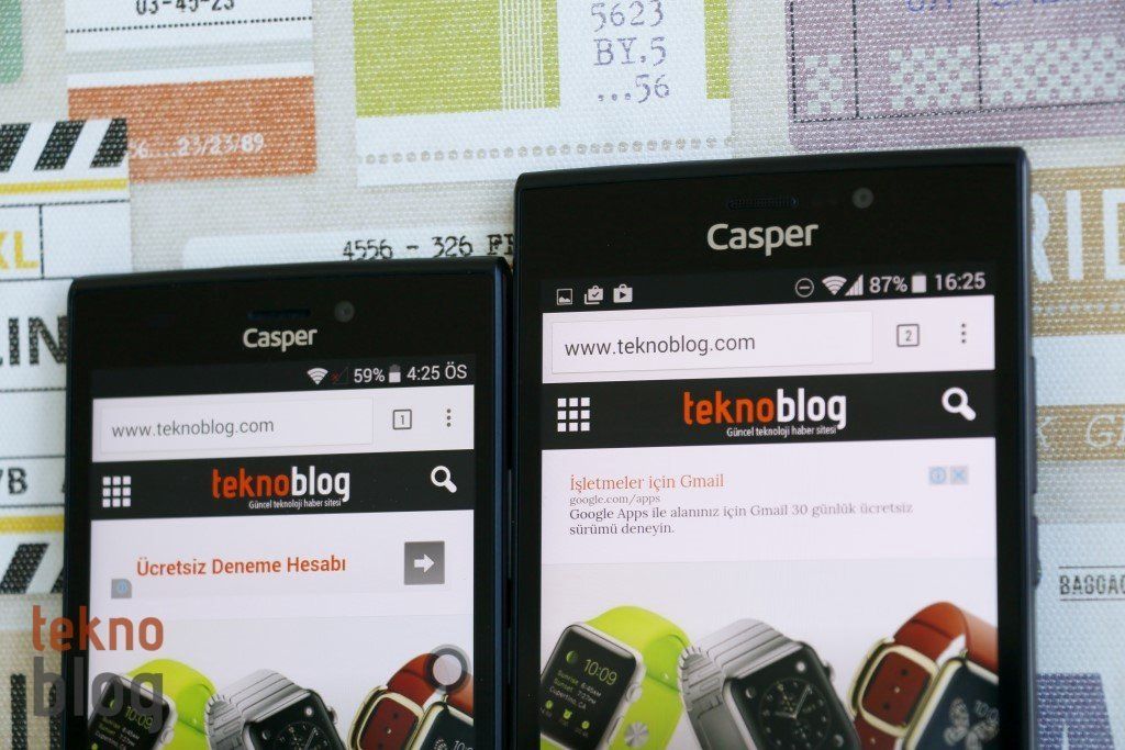 Casper VIA V6’da 5 inç, VIA V6X’te ise 5.5 inç IPS ekranlar bulunuyor. Her iki ekranın da çözünürlüğü 1280 x 720 piksel. VIA V6’nın ekranı daha küçük olduğu için doğal olarak yazılar ve grafikler daha keskin. Bunun dışında parlaklık, görüş açıları, renk canlılığı konusunda her iki ekranın birbirinden farkı yok gibi görünüyor. Ekran parlaklıkları ortamın ışık yoğunluğuna göre otomatik olarak ayarlanabiliyor, bu durum güneş ışığı altında da rahat bir kullanım imkanı sağlıyor.