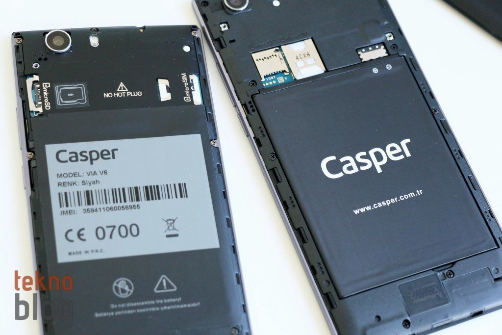 VIA V6 ve V6X’in alt kenarında microUSB portu ve mikrofon, üst kenarında 3.5 mm. kulaklık jakı yer alıyor. Sol kenarda herhangi bir giriş, çıkış veya tuş yer almıyor. Sağ kenarda ise ses tuşlarını ve güç butonunu görüyoruz. Arka kapakları kaldırdığımızda, her iki telefonda bazı farklılıklar görüyoruz. Örneğin Casper VIA V6’da sabit, kullanıcı tarafından yerinden çıkarılamayan bir pil varken, VIA V6X’in pili çıkarılabilir şekilde tasarlanmış. VIA V6’da microSD ve microSIM kartları her iki kenarda konumlandırılmışken, VIA V6X’te bunların pilin hemen üstünde olduğunu ve erişmek için de pilin yerinden çıkarılması gerektiğini görüyoruz. Her iki telefonda da sol üst köşede 13 megapiksel kamera, bunun hemen yanında da flaş yer alıyor.