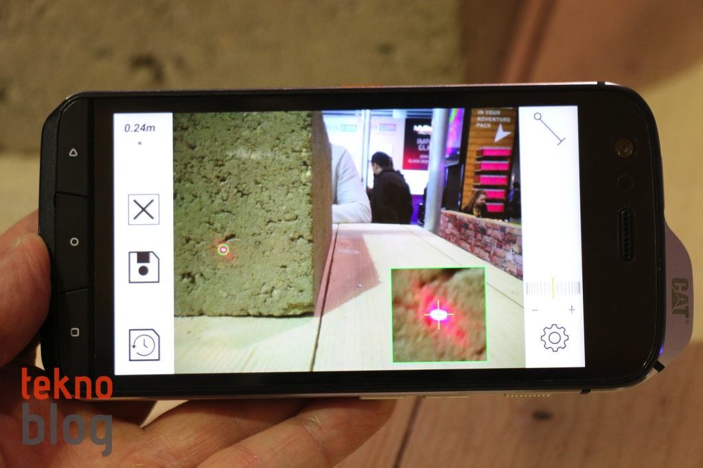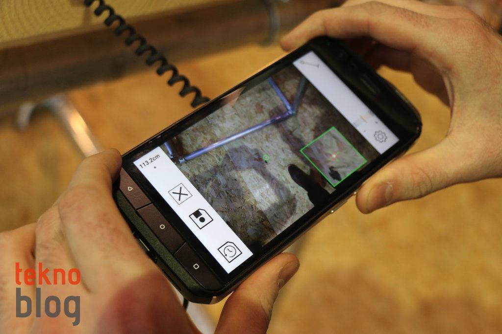 Cat S61 ile gelen bir diğer yenilik de mesafe ölçer. Arkada yer alan lazer bileşen yardımıyla Cat S61’i bir ölçüm aleti gibi kullanabilirsiniz. 10 metreye kadar ölçüm imkanı var ki, bu da birçok işte veya yerde S61’in kullanımına imkan tanıyacaktır. Denediğimiz kadarıyla bu ölçüm aracının doğruluğu yüksek. Ölçüm yapmayı sağlayan Measure uygulamasının da basit ve kullanışlı bir arayüzü var.