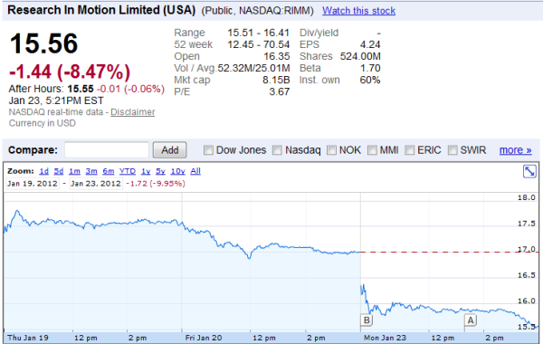 Tepe yönetiminde değişiklik yapan ve Mike Lazaridis ile Jim Balsillie yerine Thorsten Heins’ı yeni CEO olarak atayan Research in Motion‘ın hisse senetleri dünü düşüşle kapattı. Şirketin hisse senetleri ABD’deki NASDAQ borsasında işlem görüyor. Hisseler dünü yüzde 8.47’lik düşüşle kapattı.