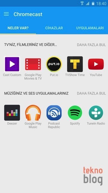 Chromecast uygulaması üç ana sekmeden oluşuyor. Birinci sekme olan Neler Var? altında Chromecast destekli TV, film video uygulamalarıyla müzik ve ses uygulamaları ayrı kategoriler altında listeleniyor. Aslında yurt dışında Chromecast uygulaması kullanıldığında Neler Var? bölümü altında çeşitli içerik tavsiyeleri de sunuluyor. Ancak Türkiye’den bağlanıldığında uygulama desteği kısıtlı olduğu için burası sadece Chromecast destekli uygulamaların kısayollarının listelendiği ve bu uygulamalara hızlı geçiş sağlayan bir bölüm olmaktan öte geçemiyor.