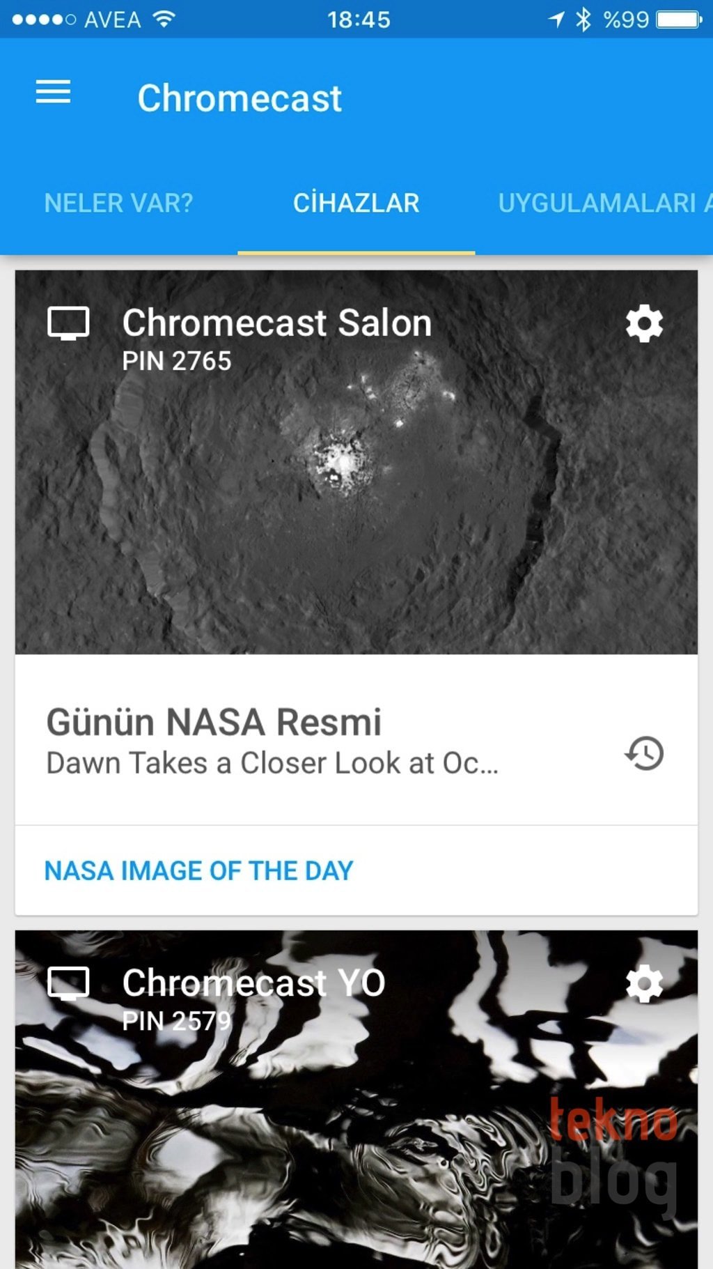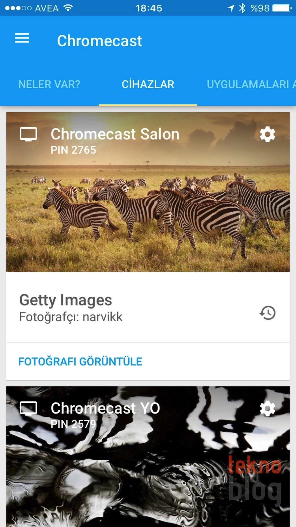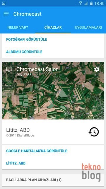 Cihazlar bölümü altında, yukarıda belirttiğimiz gibi aynı ağ altında bulunan Chromecast cihazlarını görmek, bunların kurulumunu yapmak ve daha sonra da gerekli ayarlamaları düzenlemek mümkün oluyor. Chromecast’in Arka Plan özelliği sayesinde Chromecast cihazının ana ekranında Google+ fotoğraflarını, uydu görüntülerini, vb. içerikleri görüntülemek mümkün oluyor. Cihazlar bölümü altında Chromecast ana ekranında hangi resmin görüntülendiğini görebilir, bu içerik hakkında daha fazla bilgi alabilir veya doğrudan resmin kaynağına ulaşabilirsiniz.