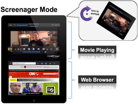 “Screenager” olarak adlandırılan özel bir mod iPad’in dikey modda kullanılırken ekranın ikiye bölünmesine, yarısında video izlenmesine yarısında da web’de gezinilmesine olanak sağlıyor. Bunun yanı sıra uygulama Wi-Fi üzerinden paylaşım, Dropbox üzerinden MP4 videoları oynatma, uygulamanın web tarayıcısı üzerinden gezilen sitelerde görülen videoların yerele kaydedilmesi gibi gelişmiş kullanıcıların beğenisini kazanacak yenilikler de sunuyor. Ekran görüntüsünü alma ve bunu film rulosuna kaydetme özelliğinden de bahsetmeden geçmeyelim.