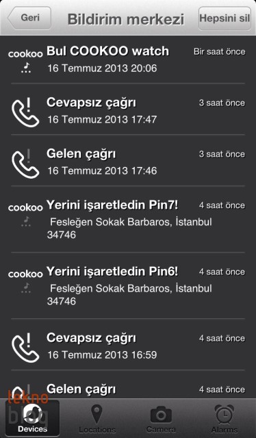 Uygulamanın en altında yer alan tepsi üzerindeyse Cihazlar sekmesi dışında Yer Bildirimi, Kamera ve Alarm sekmeleri yer alıyor. Yer Bildirimi Facebook üzerinden kolay şekilde yer bildirimi yapmayı mümkün kılarken Kamera sekmesi de saatin COMMAND tuşunu kullanarak fotoğraf çekmeye olanak sağlıyor. Alarm sekmesi altında da yeni bir alarm kurulumunu gerçekleştirebilirsiniz.