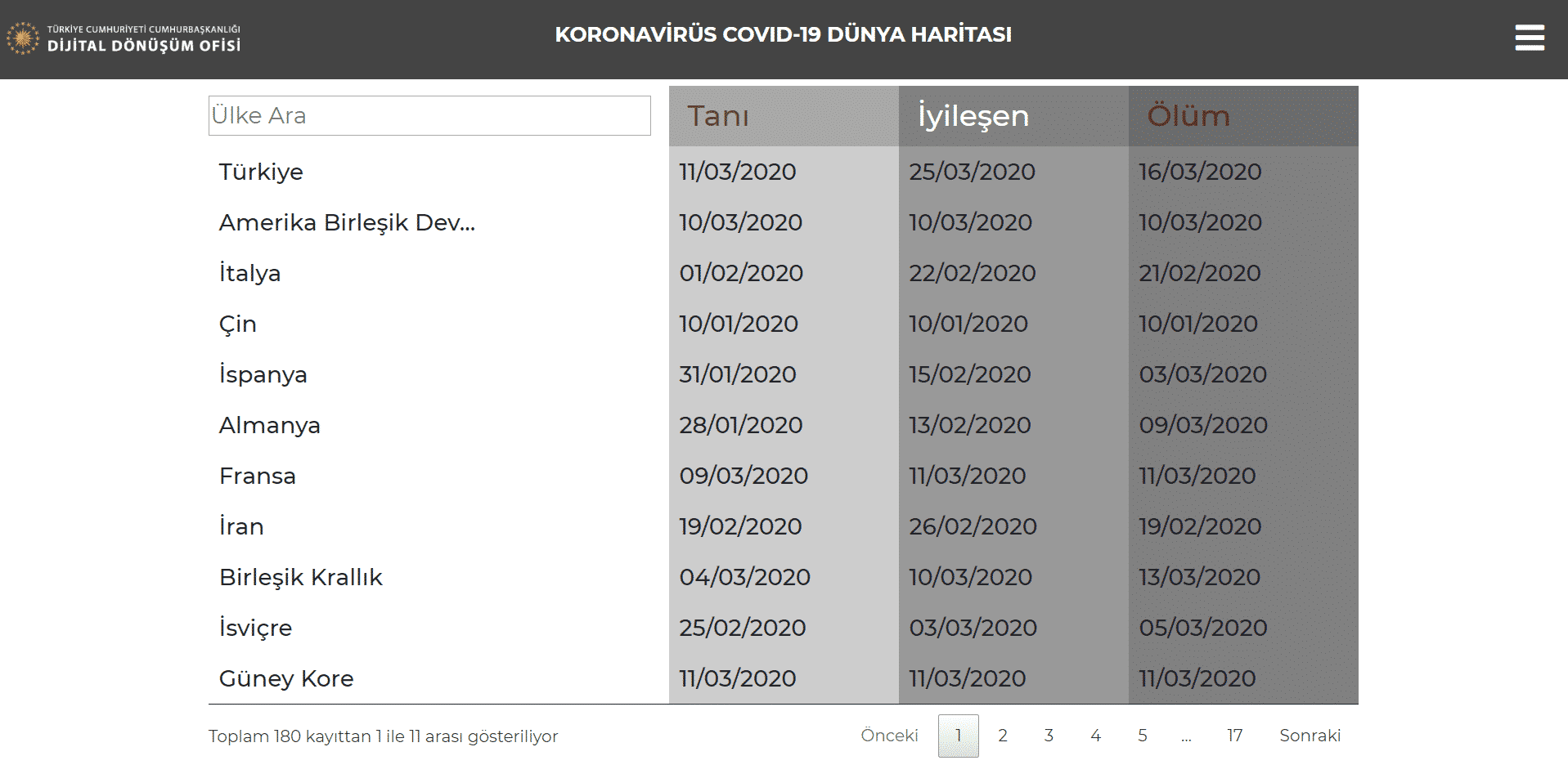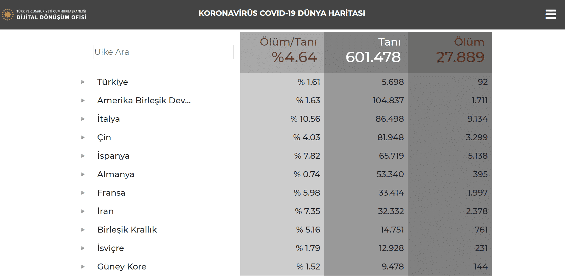 Koronavirüs salgınının dünya çapındaki seyrini detaylı biçimde takip etmek isteyenler için Cumhurbaşkanlığı Dijital Dönüşüm Ofisi özel bir site hazırladı. Koronavirüs COVID-19 özel sitesinde ülke bazındaki tanı, iyileşen ve ölüm sayılarını detaylı bir şekilde görebilirsiniz.