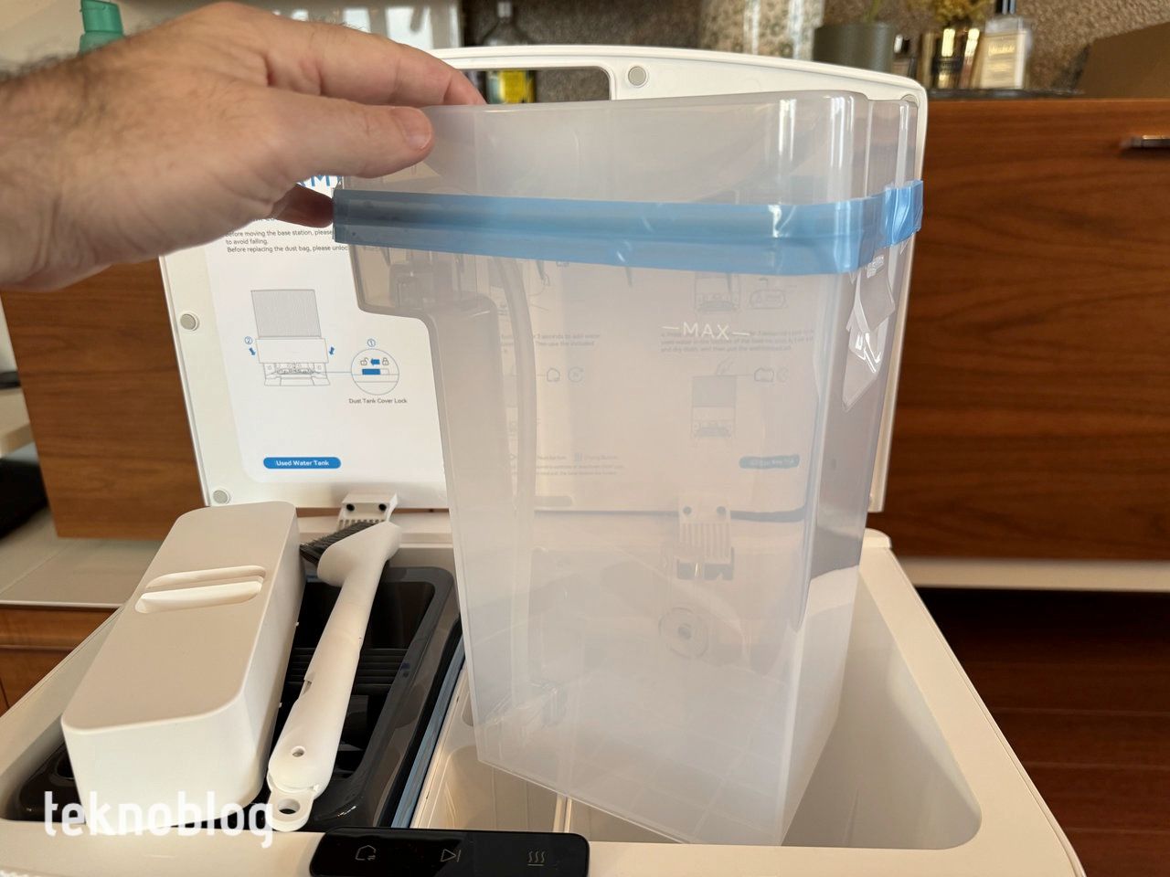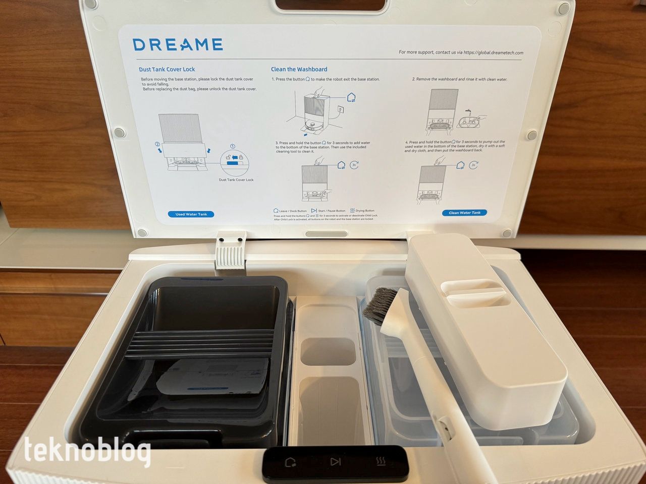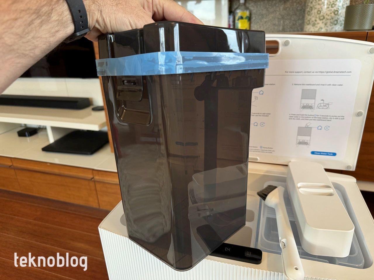 Dreame L20 Ultra’nın 4.5 litrelik kapasiteli temiz su tankı, robotun su tankını doldurarak mopun ıslak kalmasını ve yüksek temizlik verimliliğini koruyor. Büyük alanların tek seferde temizlenmesini sağlayarak, kullanıcıların zamanından tasarruf etmelerine yardımcı oluyor. Temizlik istasyonunun tepesindeki kapağı kaldırdığınızda, beyaz renkli temiz su ve siyah renkli atık su tankını göreceksiniz. Ayrıca paspas sırasında kullanılan temizlik suyunu hazırlamak amacıyla kullanılan özel solüsyon için bir bölme var. Cihazın kutusundan bir kutu solüsyon çıkıyor. Robot otomatik olarak doğru solüsyon/su oranı ile dolduruluyor, böylece sert zeminler ve evin her zaman parlamasını sağlayacak bir temizlik sağlanıyor.