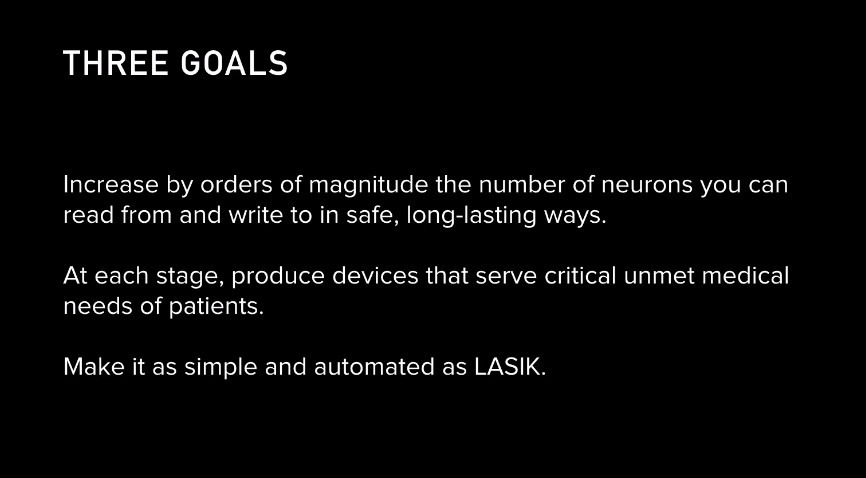 Şirketin iddialı bir hedefi de gelecek yılın ikinci çeyreğinde insan denekler üzerinde çalışmaya başlamak. Bu da habere konu olan sunum üzerinde gösteriliyor. Aynı zamanda beyne yerleştirilmesi planlanan bilgisayar parçasının fotoğrafı da gösteriliyor.