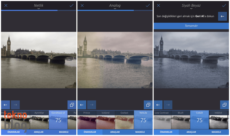 Düzenleme araçlarının yukarıdan aşağıya sıralanışı ise uygulama sırasına göre gerçekleştirilmişe benziyor. Enlight ilk olarak kullanıcılardan fotoğraflarını kırpma, bükme, boyutlandırma gibi işlemleri tamamlamaları isteniyor. Bu aşamanın ardından sıra netlik, hedef, keskinlik, kontrast gibi görüntü ayarlarına geliyor. Görüntü ayarlarını filtreleme süreci takip ediyor. Enlight’ın sunduğu filtreler analog, siyah-beyaz ve ikili adını taşıyan üç farklı kategoride toplanıyor. Filtrelerin sunumu konusunda bu tarz bir özelleştirilmeye gidilmiş olması Enlight’ın pozitif özelliklerinden biri olarak ön plana çıkıyor.