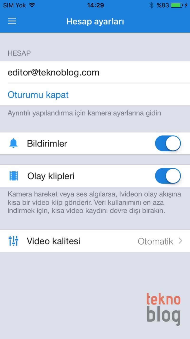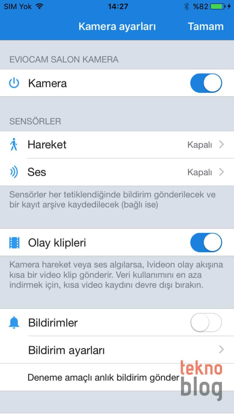 Hareket ve ses algılanmasını aktif hâle getirip, aynı zamanda bildirimleri de etkinleştirdiğiniz takdirde, iVideon uygulaması bir hareket veya ses tespit edildiğinde bildirim gönderiyor. Her hareket veya seste bildirim gelmesi rahatsız edici olduğu için bu ayarı çoğunlukla kapalı tutmayı tercih ettik. Bunun dışında olay klipleri özelliğini etkinleştirerek, hareket veya ses algılandığında olay akışına kısa bir video klip gönderilmesini sağlayabilirsiniz. Bu sayede kameranın önünde bir kişi geçtiğinde veya bir ses duyulduğunda, kısa sürelik bir video klip kaydediliyor ve bu video buluta yükleniyor. Olay klipleri kullanışlı, ancak bu özellik nedeniyle internet üzerinden yüklenen dosya miktarı artacağı için kotanız çabuk dolabilir veya adil kullanım noktasına hızlı şekilde erişebilirsiniz.