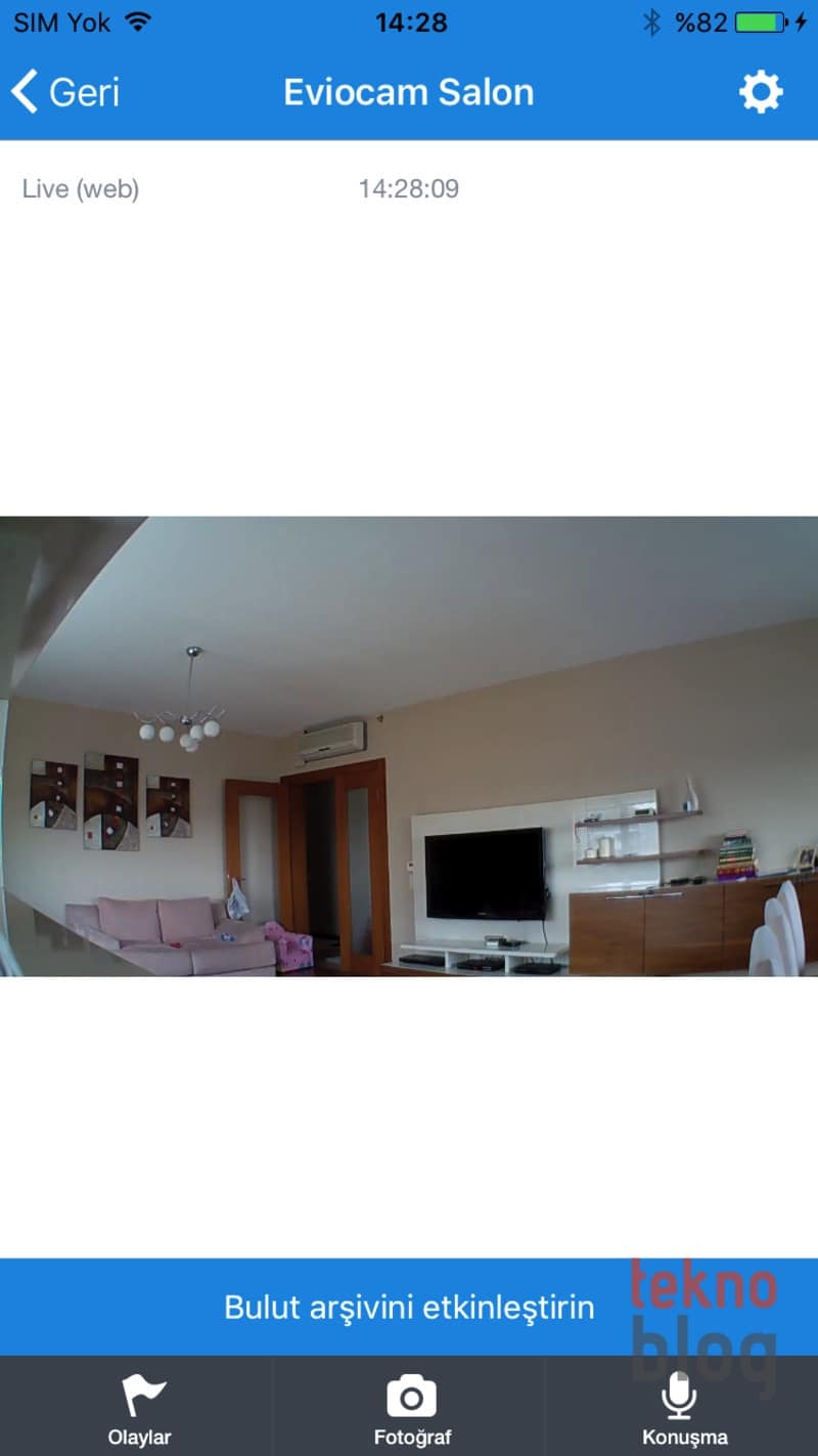 Yukarıda da belirttiğimiz gibi, Eviocam ile 720p kalitesinde kayıt yapılabiliyor. Görüntü kalitesi elle seçilebileceği gibi, bağlantı hızına ve kalitesine göre otomatik olarak ayarlanıyor. 16:9 görüntü oranına sahip görüntüler oluşturan kameranın 120 derecelik geniş bir açısı bulunuyor. Aslında döndürülebilir kameralar biraz daha fazla esneklik ve odanın daha geniş kısmını kontrol etme imkanı sunması bakımından tercih edilebilir, ancak sabit yapıdaki Eviocam’in bu geniş açısı odanın büyük bir bölümünü görme fırsatı sunuyor. Eğer Eviocam’i odanın bir köşesine ve özellikle tavan ile duvar birleşimine konumlandırırsanız, odanın neredeyse tamamını görüş alanına almanız mümkün hâle gelecektir.