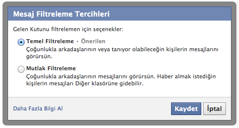 Arkadaşlarınızdan gelen Facebook mesajları herhangi bir sorun olmaksızın gelen kutusuna düşüyor. Ancak ortak arkadaşınızın bulunmadığı kişilerden gelen mesajlar genellikle “Diğer” klasörüne atılıyor; kullanıcıların bu klasörü pek sık kontrol ettiği söylenemez, bu nedenle gelen mesajlar da unutulup gidiyor. Facebook yeniden düzenlemeyle, daha önce sunulan “Sana kimler Facebook mesajları gönderebilir?” ayarını kaldırıyor. Bunun yerine Temel ve Mutlak olmak üzere iki farklı filtreleme seçeneği getiriyor ve herkesin birbirine mesaj göndermesine olanak tanıyor. Temel Filtrelemede çoğunlukla arkadaşlarınızın veya tanıyor olabileceğiniz kişilerin mesajlarını görürken, Mutlak Filtreleme seçeneğinin etkinleştirilmesi durumunda ise çoğunlukla arkadaşlarınızın mesajlarını göreceksiniz. Haber almak istediğiniz kişilerin mesajları Diğer klasörüne gidecek.