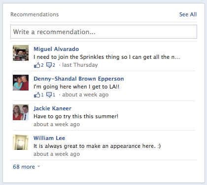Eğer sıkı bir Facebook kullanıcısıysanız, Sayfalar’ın eski halinde bir Öneriler kutusu yer aldığını muhtemelen hatırlarsınız. Zaman Tüneli’nin hayata geçmesiyle beraber ortadan kaybolan bu kutu, Zaman Tüneli özelliğini kullanan konum bazlı sayfalarda yeniden kullanılmaya başlandı. Bu özellik sayesinde Facebook kullanıcıları, mesela bir restoran hakkındaki düşüncelerini diğer kullanıcılar ile paylaşabilecek.