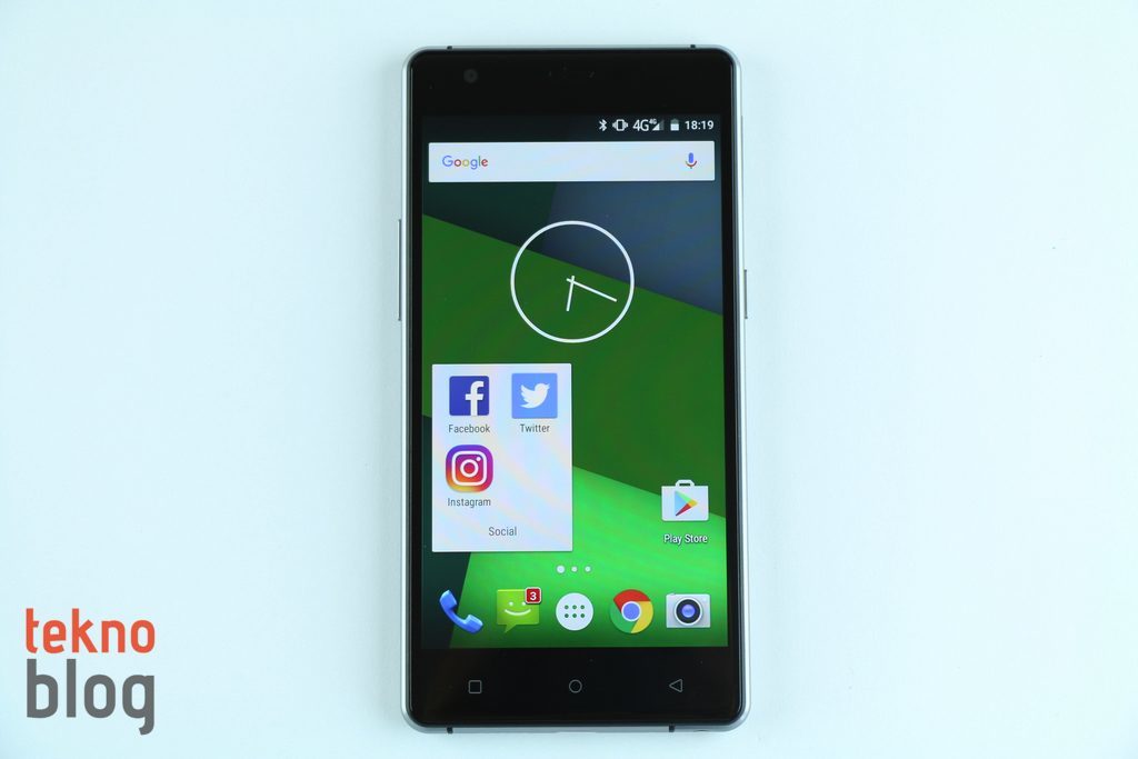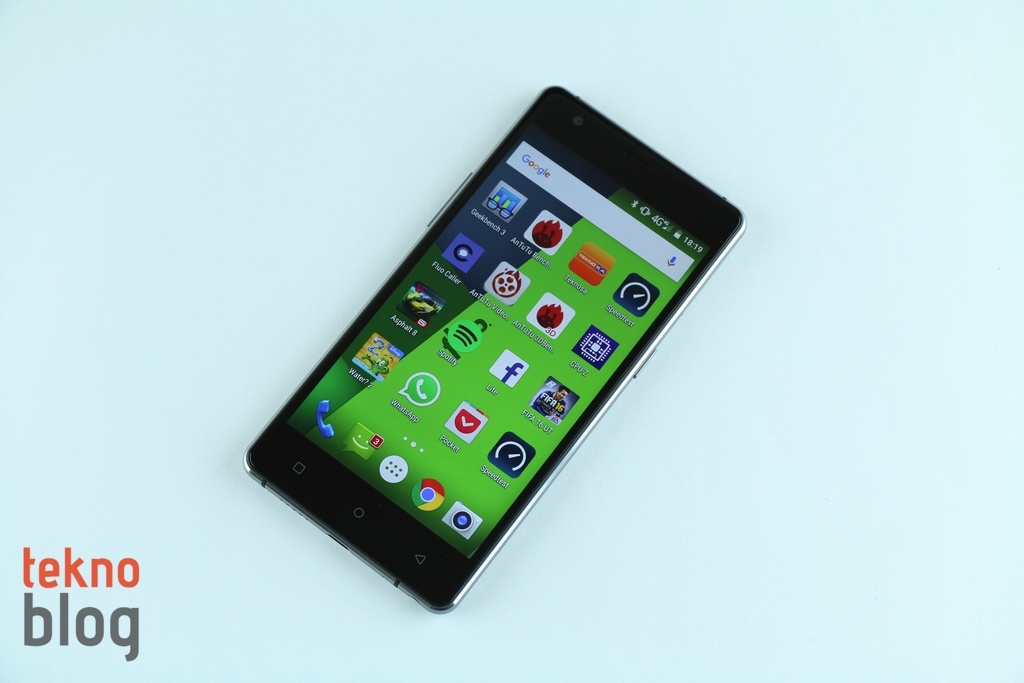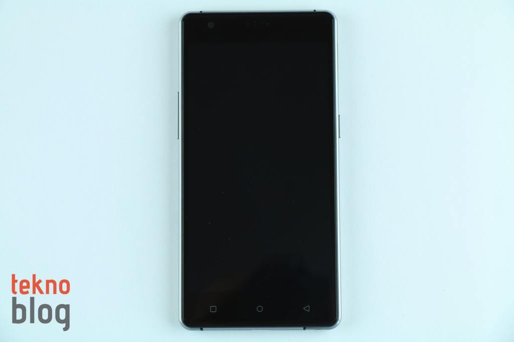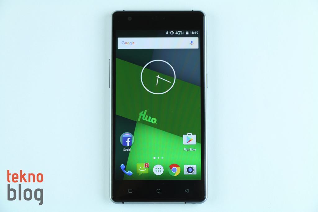 Önde yer alan 5 inç ekran epey geniş bir alan kaplıyor. Bu da Fluo X’in yüzey alanını gereksiz yere büyütmüyor ve 5 inç ekranlı bir telefon için makul boyutlara sahip, kompakt olarak nitelendirebileceğimiz bir gövdenin elde edilmesini sağlıyor. İnce profili ve dar ekran çerçevesi sayesinde Fluo X’i tek elle rahat şekilde yönetebilirsiniz, baş parmağınız ekranın çoğu noktasına zahmetsizce erişiyor, ses ve güç tuşları da sol ve sağ kenarlarda, telefonu avuç içinde hareket ettirmeden erişilebilecek şekilde yerleştirilmiş. Ekranın altında kapasitif dokunmatik fiziksel navigasyon tuşları mevcut. Ortada ana ekran tuşu yer alırken, alışılmışın dışında geri tuşu sağa, çoklu görev tuşu ise sola yerleştirilmiş. Ve yine ilginçtir ki, çoklu görev ekranını açmak için normalde çoklu görev olarak bildiğimiz soldaki butonu değil, ana ekran tuşunu, dokundurup bekleterek kullanmanız gerekiyor.