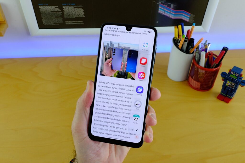 One UI 7 arayüzü, Samsung kullanıcılarının alışık olduğu yapıyı büyük ölçüde koruyor. Arayüz genel olarak sade, simgeler modern ve geçişler oldukça akıcı. Ancak donanım sınırlamaları nedeniyle Galaxy A26’ya bazı özellikler uğramamış diyebiliriz. Örneğin, Galaxy AI kapsamında sunulan bazı yapay zekâ destekli yenilikler bu modelde yer almıyor. Buna rağmen, Google’ın Circle to Search özelliği, Galeri uygulamasındaki nesne silme aracı ve yeni nesil AI Select gibi temel işlevler mevcut. Özellikle ekran üzerindeki içeriklerden metin çekmek ya da ekran görüntülerinden görsel kırpma yapmak gibi işler artık birkaç dokunuşla halledilebiliyor. Günlük kullanıcı için yeterli işlevselliğe sahip bu özellikler, üst segmenti aratmayan küçük dokunuşlar sunuyor.
