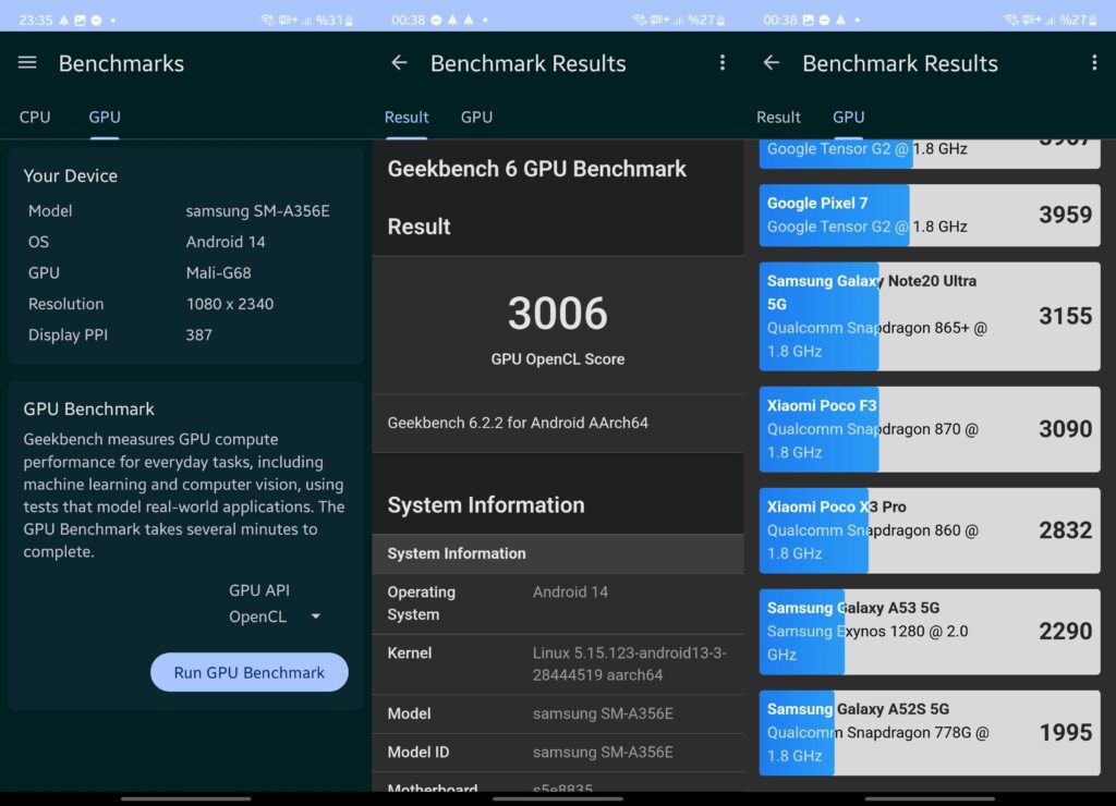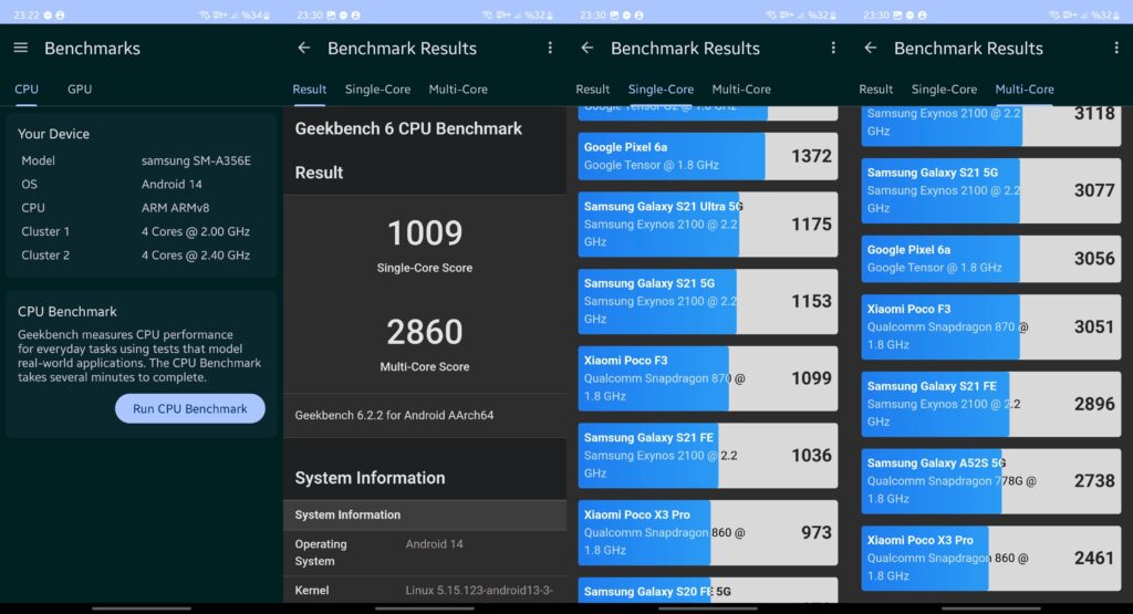 Exynos 1380 işlemci, günlük işler için iyi bir performans sağlıyor. Ara sıra uygulama geçiş ekranında sürüklemelerde ve uygulamalar arasında geçişlerde takılmalar görsek de, genel olarak akıcı ve düzgün bir performans sağlanıyor. Telefon çok fazla da ısınmıyor. PUBG Mobile’ı da yüksek grafik ayarlarında akıcı biçimde oynamak, hamleleri hızlı şekilde yapmak mümkün. Galaxy A55, Exynos 1480’in grafik gücü tarafında sağladığı avantaj sayesinde biraz daha önde görünüyor. Ancak A35’in performansı da 15 bin TL civarında fiyata sahip bir telefon için gayet düzgün. Bu arada Galaxy A54 ile yaptığımız GeekBench 6 testleriyle aşağı yukarı aynı sonuçları aldığımızı belirtmeden geçmeyelim.