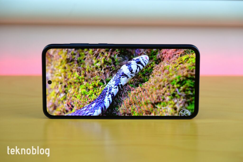 Galaxy A35’te de 6.6 inçlik bir Super AMOLED ekran var. 1000 nit maksimum parlaklık ile güneş ışığı altında bile yeterli bir görüş var. Yüksek parlaklık, YouTube gibi platformlarda HDR videoları hakkını vererek izlemeyi sağlıyor. 1080 x 2340 piksel çözünürlüklü ve 19.5:9 görüntü oranlı ekran, dikey kullanımda sosyal medya uygulamalarında gezinme, web sayfalarını görüntüleme, aynı anda iki uygulamayı bölünmüş pencerelerde kullanma gibi işlerde yeterli oluyor. Super AMOLED ekranın varlığı geniş görüş açılarının yanında Always on Display özelliğinin de verimli bir şekilde kullanılmasına izin veriyor.