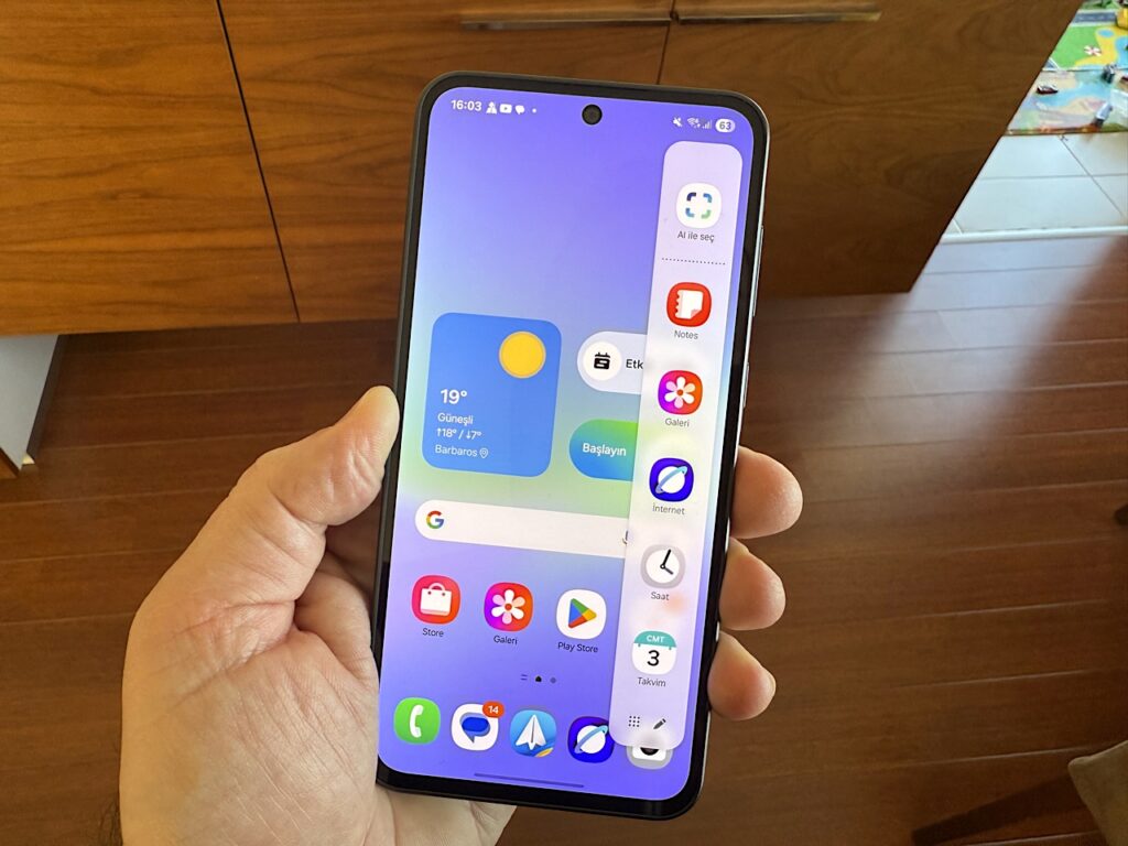 One UI 7 ile gelen yeniliklerden biri de “Now Bar” adı verilen özellik. Bu fonksiyon, Apple’ın Dynamic Island konseptine benzer şekilde, telefon kilitliyken veya farklı bir uygulamadayken bile bazı canlı bildirim ve durumları ekranın üst kısmında küçük bir çubuk halinde gösteriyor. Örneğin müzik çalarken, zamanlayıcı geri sayım yaparken ya da bir yolculuk takibi sırasında Now Bar üzerinden temel bilgiler ve kontrol imkânları sunuluyor. Bu sayede kullanıcı, uygulamalar arası geçiş yapmadan bazı işlemleri takip edebiliyor veya kontrol edebiliyor. Tek elle kullanım kolaylığı da One UI 7’nin odaklandığı konulardan biri. Uygulama menüsündeki arama çubuğu artık ekranın alt kısmına yakın konumlandırılmış, böylece büyük ekranda baş parmakla erişim kolaylaşmış. Benzer şekilde Kamera uygulaması ve Samsung’un temel uygulamalarında da menü ve butonlar biraz daha aşağıya alınarak ergonomi iyileştirmeleri yapılmış. Tüm bu yazılımsal dokunuşlar, Galaxy A36’nın kullanıcı deneyimini daha modern ve kullanışlı hale getirmeyi amaçlıyor.