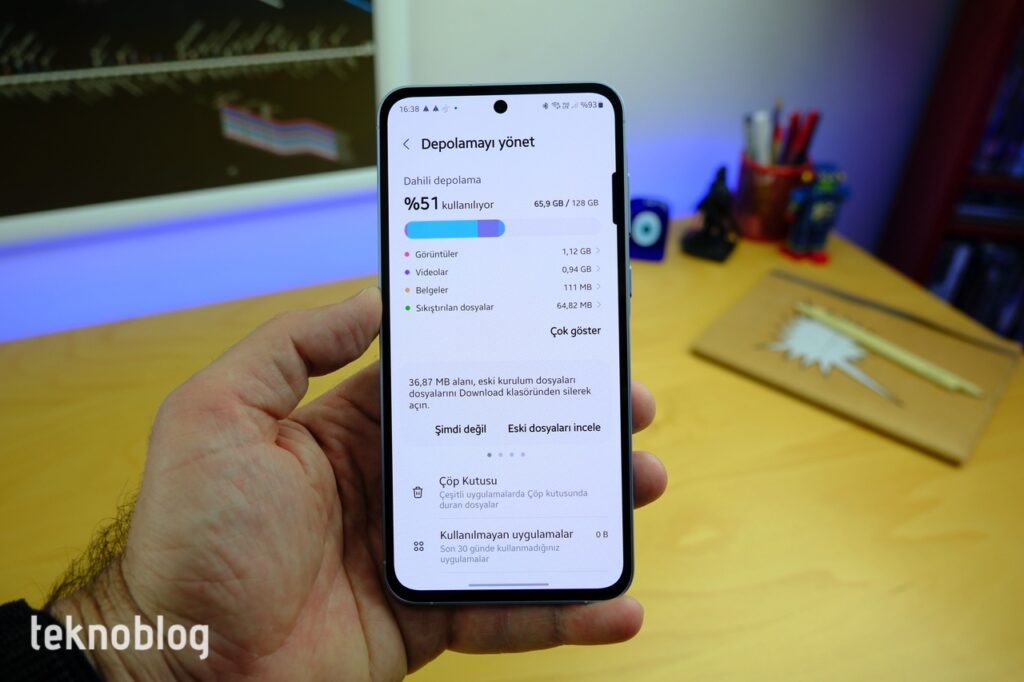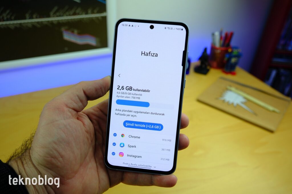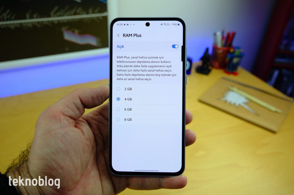 Telefonun 8 GB RAM’inin yanı sıra RAM Plus özelliği sayesinde 8 GB’a kadar sanal RAM desteği sağlamak mümkün. Varsayılanda 4 GB’lık bir RAM Plus açık durumda ve daha fazlasına da pek ihtiyaç duymuyorsunuz. Mevcut hâliyle aynı anda birkaç uygulamayı rahatlıkla, kaldığınız yerden devam ederek kullanmanız mümkün oluyor. Depolama seçenekleri tarafında 128 GB ve 256 GB seçenekleri mevcut. Samsung’un bize gönderdiği test ürününde 128 GB’lık kapasite mevcut. Eğer çok fazla oyun veya uygulama yüklerseniz, aynı zamanda fotoğraf ve video çekiminde cömert davranırsanız, belli bir süre sonra bu alan yetmemeye başlayabilir. Neyse ki, 1 TB’a kadar kapasiteye sahip kartları destekleyen microSD kart yuvasının varlığı, 256 GB seçeneğinin yanı sıra microSD kart ile de devam etme imkanının bulunduğu anlamına geliyor.