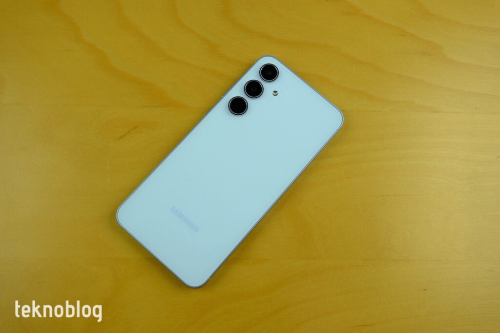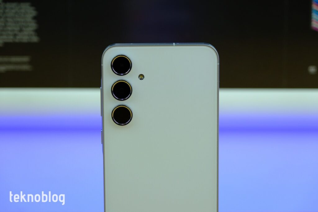 Camla kaplı arka yüzün tasarımına baktığımızda, kamera lenslerinin etrafını saran çerçevelerin biraz daha keskin ve belirgin hâle getirildiğini görüyoruz. A54 ile karşılaştırıldığında daha fazla amiral gemisi telefon havasını veriyor. Samsung renk seçeneklerini yenilemiş; mavi, siyah ve sarı olmak üzere üç renk var. Samsung’un bize gönderdiği mavi renk, aslında çok açık tonlarda, bunun beyaz renk olduğunu bile düşünebilirsiniz. Açık renkleri sevenler için gerçekten hoş bir seçim olacaktır.