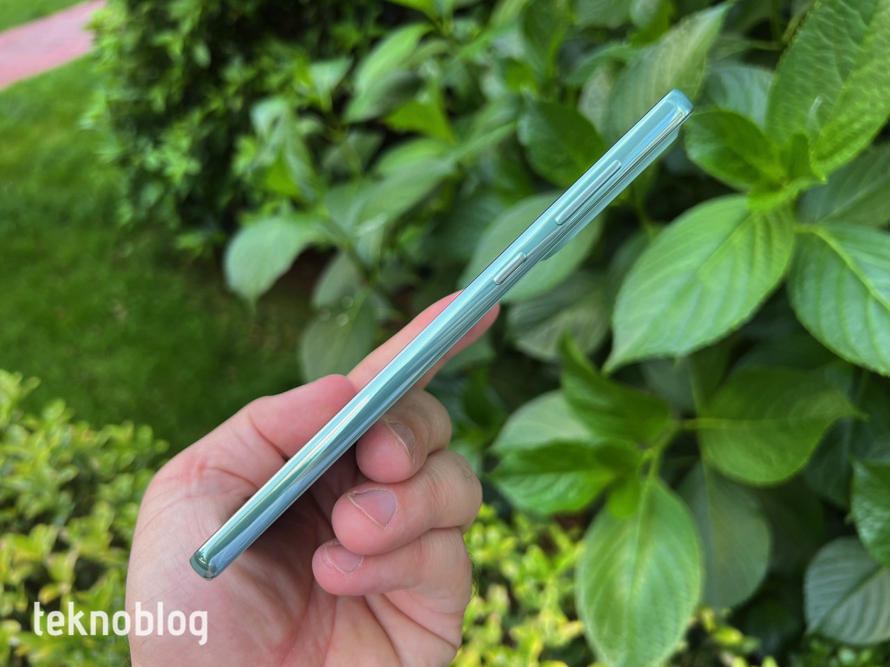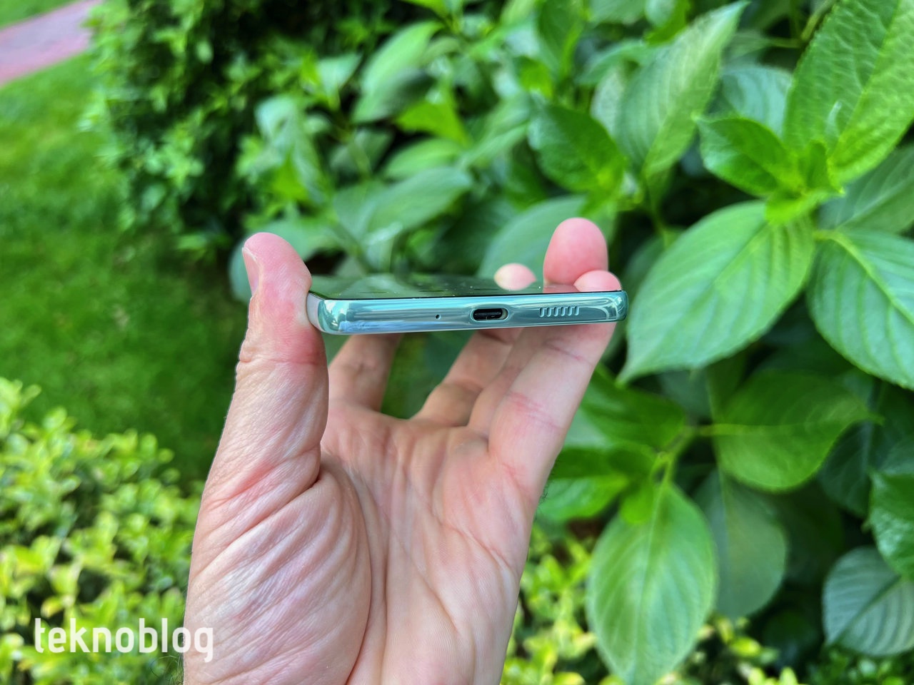 Galaxy A73’ün alt kenarında USB-C portu, mikrofon ve hoparlör var. Ekranın hemen üst kısmındaki ahize bölümünde ikinci bir hoparlör daha var. Üst kenarda ikinci mikrofon, nano SIM ve microSD kartları barındıran tepsi var. Sağ kenarda ses ve güç tuşları var. Bunların derinliği iyi, çok sert değil, el yordamıyla rahatlıkla bulunuyor ve kullanılabiliyor.