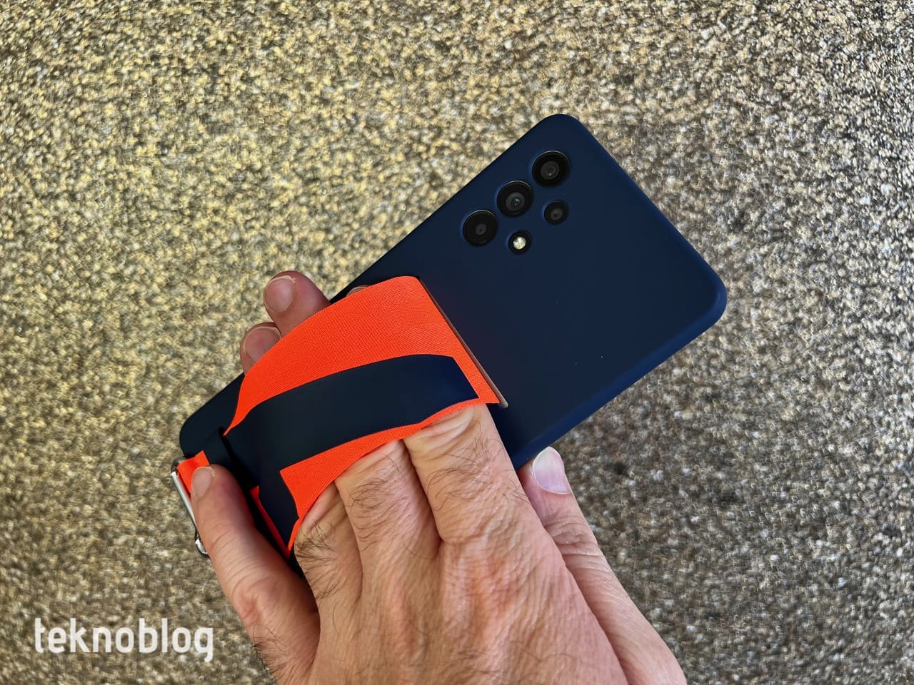 Samsung, Galaxy A73’ü gönderirken yanına bir adet kılıf da eklemiş. Daha önce Galaxy Z Flip 3 ve S22 serisi için benzerlerini gördüğümüz, arkasında parmaklarınızı rahatlıkla geçirip tek elle kullanmanıza izin verecek bir kayışa sahip olan kılıf var. Lacivert renkli silikon kılıf telefona sıkıca sarılıyor. Arkasındaki neon turuncusu kayışı ve üzerindeki A harfini andıran sembolü de ayrı bir hava katıyor. Bunun dışında başka kılıf seçenekleri de var.