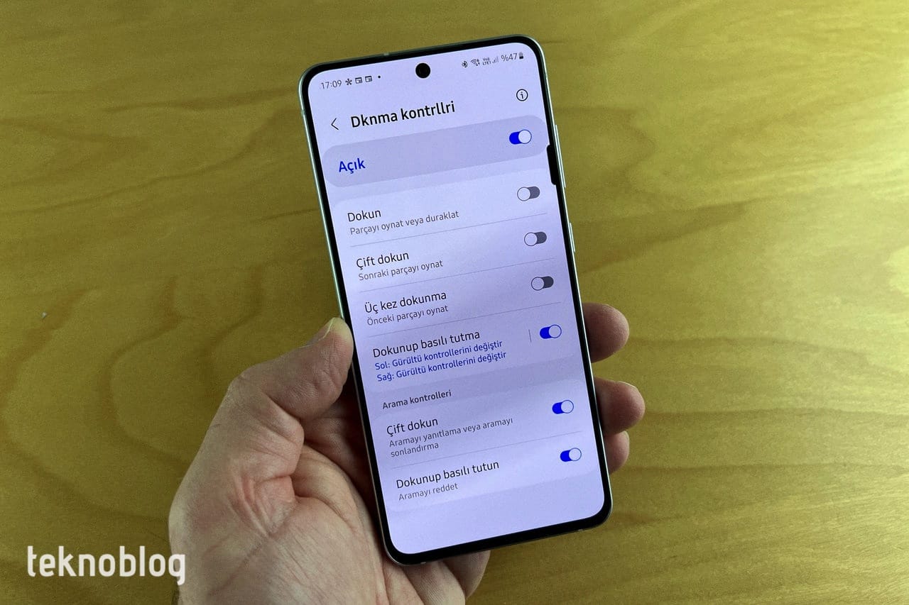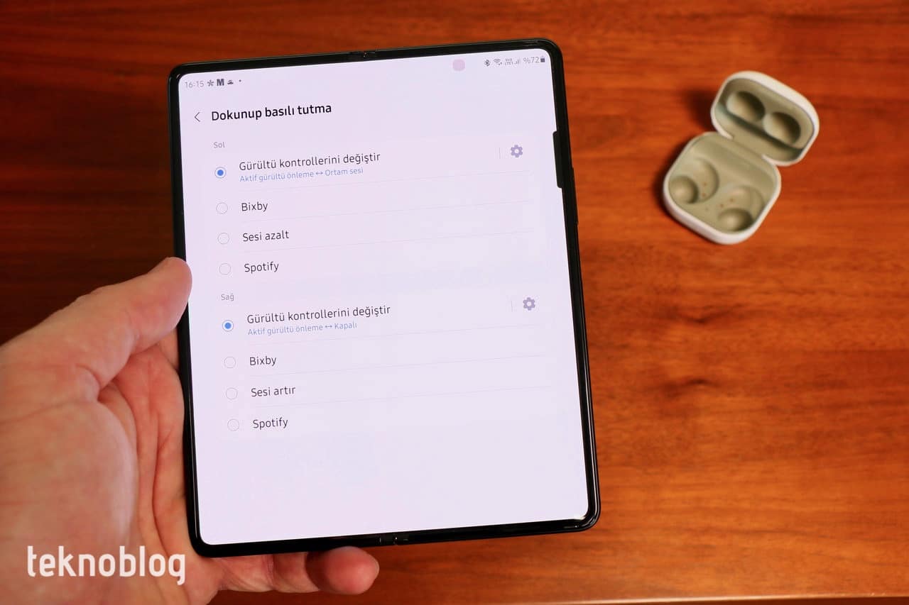 Söz dokunmatik kontrollerden açılmışken, Galaxy Buds 2’nin dış yüzeyi dokunmaya karşı hassas. Tek dokunuşla parçayı oynatma veya duraklatma, çift dokunmayla sonraki parçaya, üç kez dokunmayla önceki parçaya geçiş mümkün. Telefon aramaları sırasında da çift dokunarak aramayı yanıtlama veya sonlandırma, dokunup basılı tutarak aramayı reddetme yapılabiliyor. Bu arada dokunup basılı tutma gürültü kontrollerini değiştirme, Bixby, sesi azaltma veya artırma ya da Spotify gibi işlevler için ayarlanabiliyor. Öte yandan daha sonra güncelleme ile gelen bir özellik neticesinde kulaklıkların kenarlarına çift dokunarak sesi azaltma veya artırma yapılır hâle geldi. Ancak bunu Galaxy Wearable uygulamasında bulunan Labs bölümünden açmak gerekiyor.