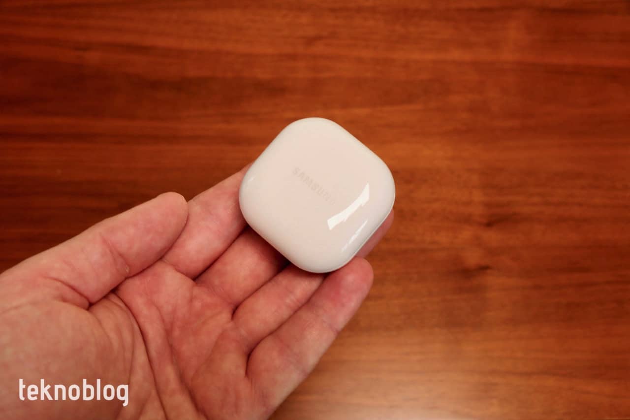 Samsung, diğer çoğu şirketten farklı olarak tam kablosuz kulaklıklarında gövdesiz bir tasarımı tercih ediyor. Bu açıdan Apple’ın AirPods veya Huawei’nin FreeBuds serisi kulaklıklarından farklılık gösteriyor. Şirketin daha önce Galaxy Buds Live ile fasulye biçiminde kulaklık bile tasarladığını görmüştük. Buds 2 ise, Galaxy Buds serisinin klasik tasarımına biraz daha yakın görünüyor. Çakıl taşına benzer görünüme sahip olan kulaklık küçük boyutlu ve genel olarak yuvarlatılmış bir biçime sahip. Plastikten yapılmış, parlak yüzeyi ise bir hayli pürüzsüz. Kulaklıkları muhafaza ve şarj etmeye yarayan kılıfı da, hem kulaklıklar gibi küçük boyutlu, hem de onlarla aynı malzemeye ve parlak yüzeye sahip.