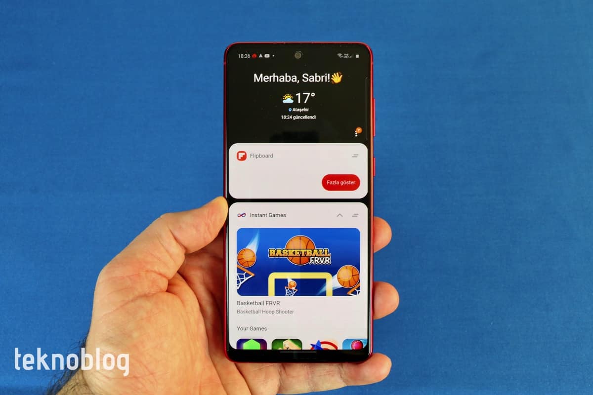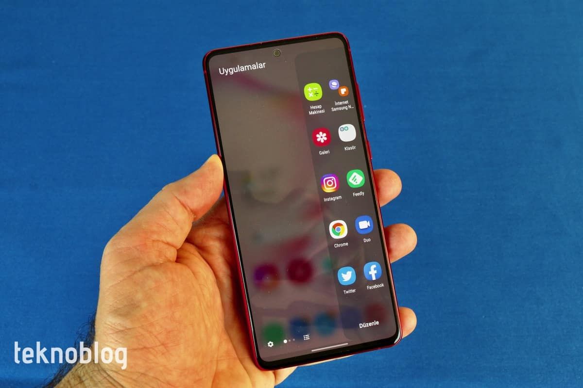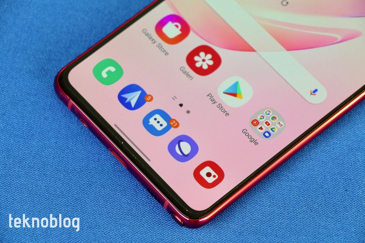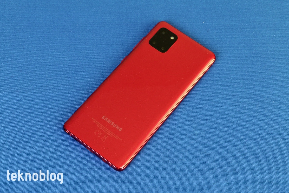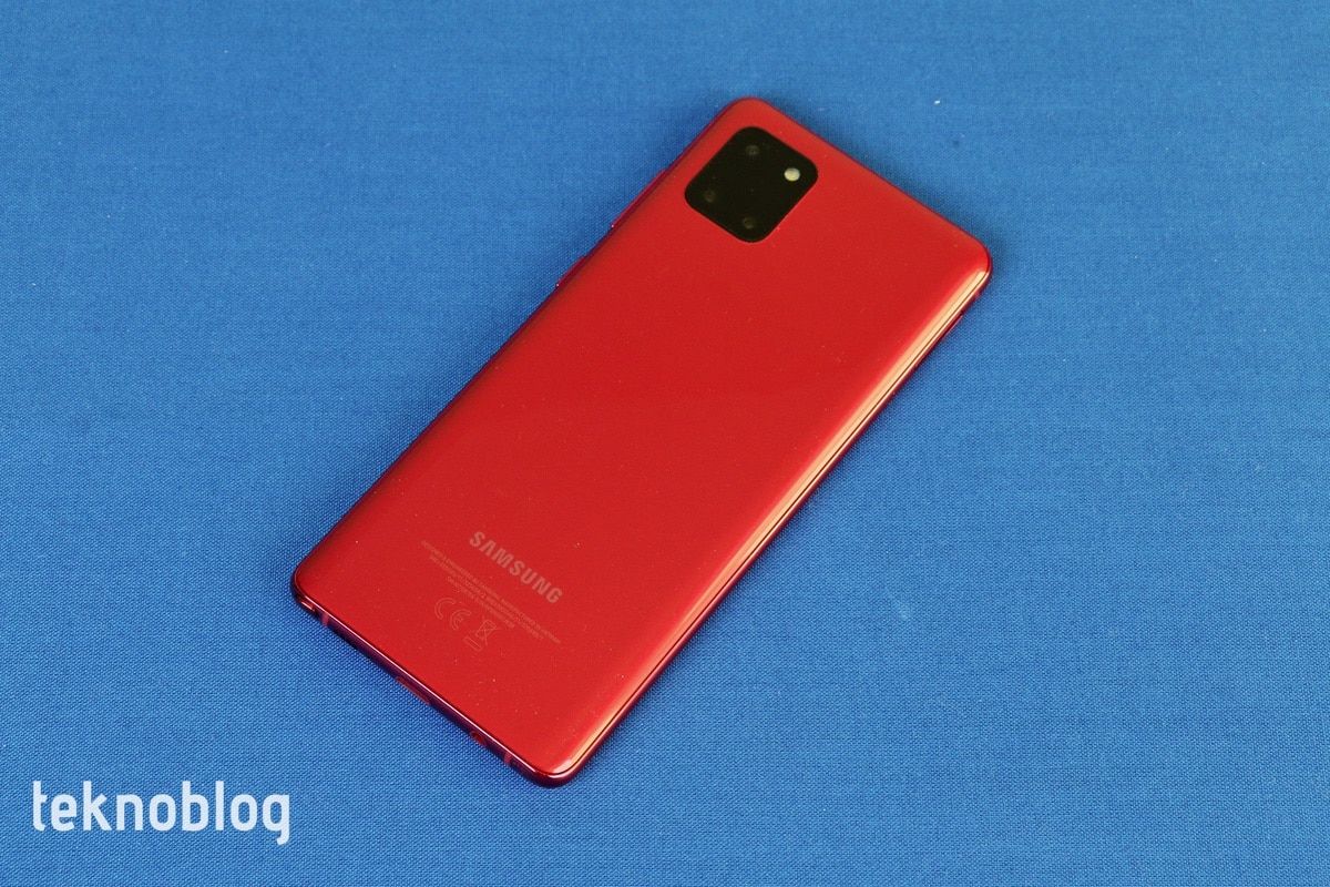 Elimizde Galaxy Note 10 Lite’ın kırmızı, daha doğrusu ateş kırmızısı renkli versiyonu var. Bunun dışında ay tozu grisi ve duman siyahı adını taşıyan renk seçenekleri de var. Ateş kırmızısının diğer renklere göre telefonun sıkıcı görünen tasarımını biraz daha hareketlendirdiğini söyleyebiliriz. Parlak görünümlü arka yüzey de kırmızı renkle birleşince çekiciliği artıyor. Arka yüzün parmak izi ve kiri tutma konusunda epey cömert davrandığını söyleyebiliriz. Ancak çiziklere karşı ise başarılı bir grafik çiziyor.