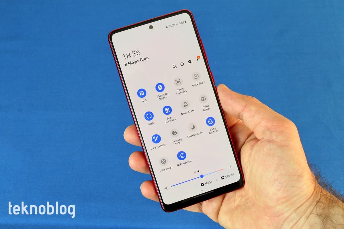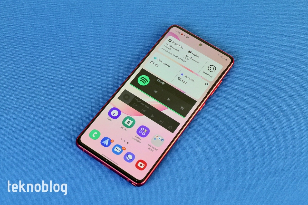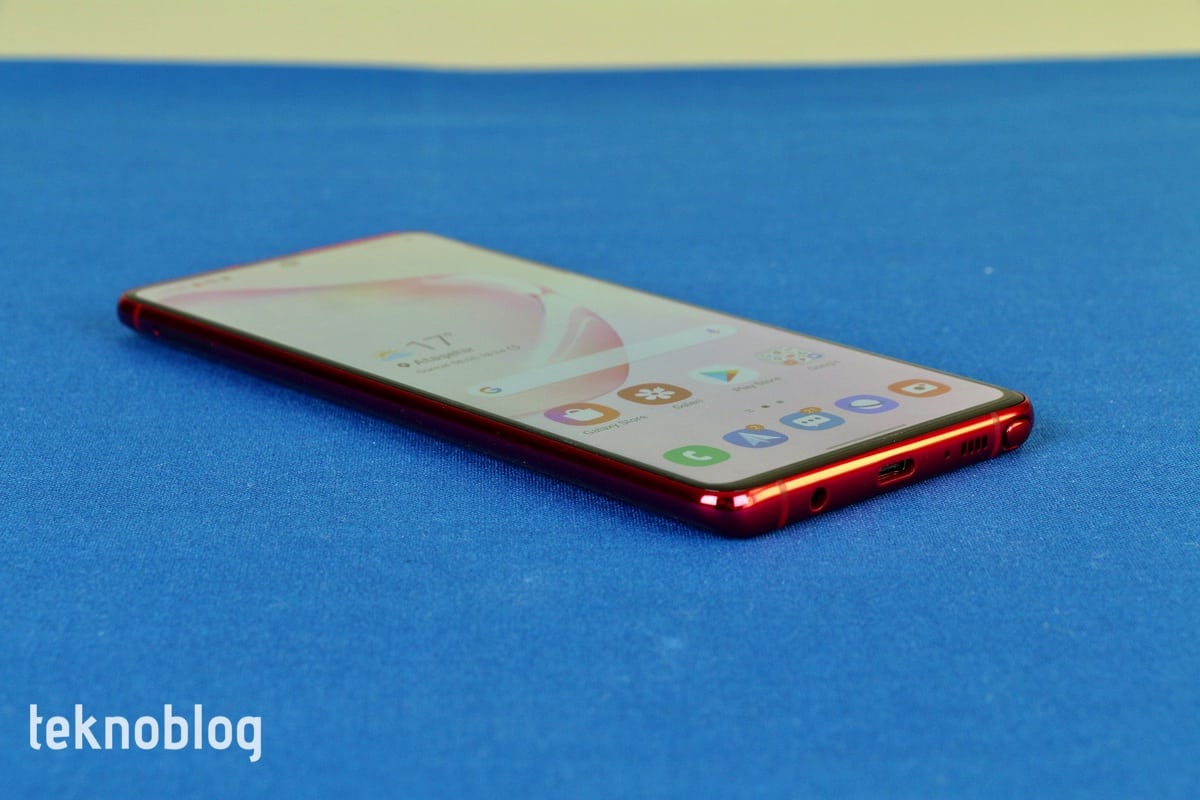 Alt kenarda USB-C portu, mikrofon, hoparlör ve S Pen yuvası var. Galaxy S10 Lite’da yokken, Galaxy Note 10 Lite’da 3.5mm kulaklık jakının bulunduğunu görüyoruz. Fiyatı yakın olan bu iki model arasında kararsız kalanlar için bu fark etkili olabilir. Üst kenarda ikinci bir mikrofon var. Sağ kenarda ses tuşlarını ve güç butonunu görüyoruz. Tuşların derinliği iyi, aynı zamanda ne çok sert, ne de çok yumuşak. El yordamıyla da rahatlıkla kullanılabiliyor. Sol kenarda ise nano SIM kart ve microSD kart tepsisini görüyoruz. Ayrıca bellek kartından fedakarlık yaparak ikinci bir hattı da Galaxy Note 10 Lite’ı kullanabilirsiniz.