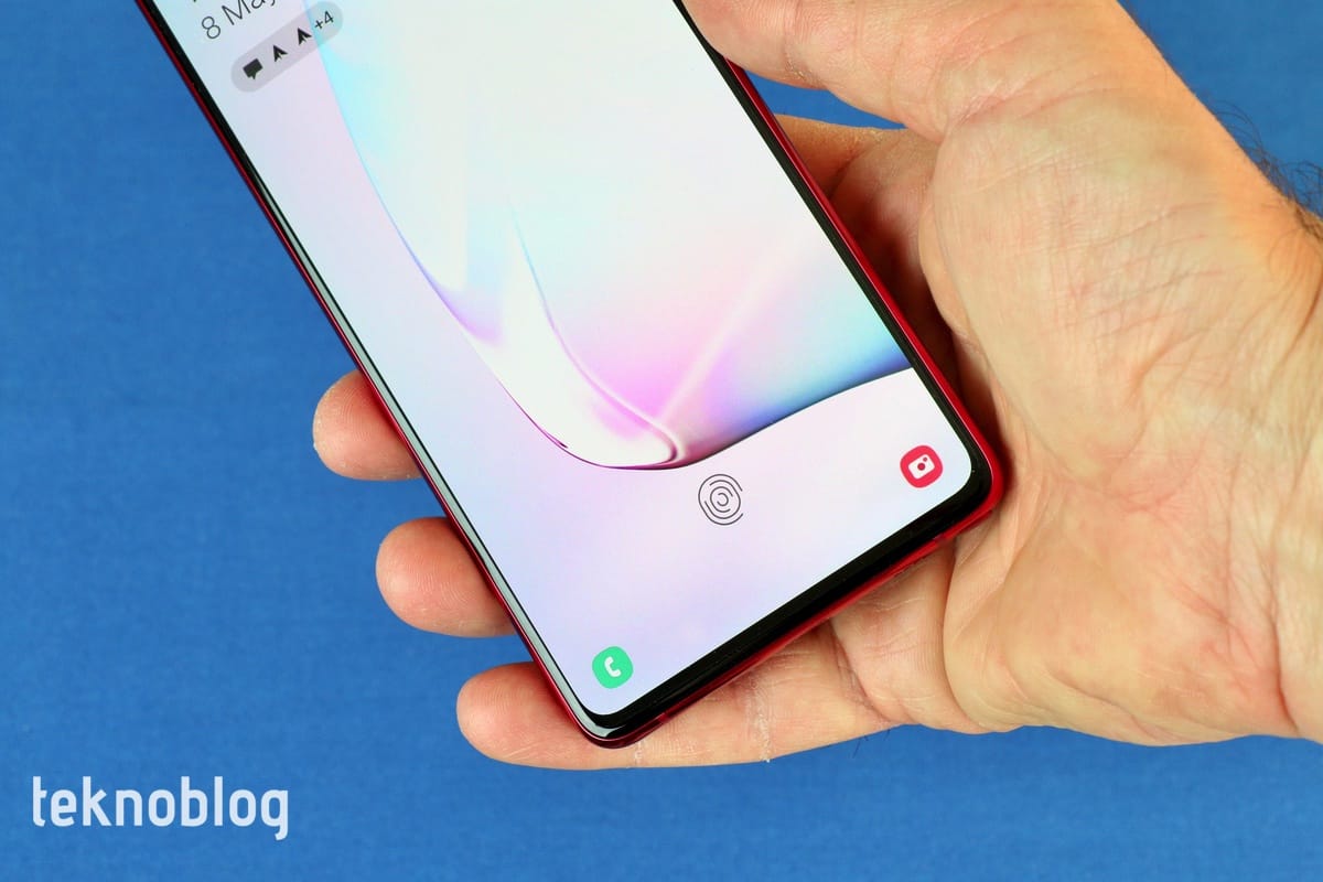 Ön tarafta Samsung’un Sonsuz-O olarak adlandırdığı ekran tasarımı kullanılıyor. Note 10 serisinin diğer üyelerinde de gördüğümüz bu ekranın üst kısmında ortalanmış bir kamera deliği var ve burada selfie kamera bulunuyor. Kamera deliği mümkün olduğu kadar küçük tutulmuş. Böylelikle tam ekranda görünümde fazla bir sıkıntı da çıkmıyor. Ekran, Note 10 serisinin daha pahalı üyeleri gibi kavisli değil, düz. Arka tarafta ise üç kameranın sol üst köşeye, dikdörtgen şekilli bir kamera modülüne yerleştirildiğini görüyoruz. Kamera modülü çok çekici görünmüyor, ancak dışa doğru çok az sızıntı yapmasını bir artı olarak nitelendirebiliriz.
