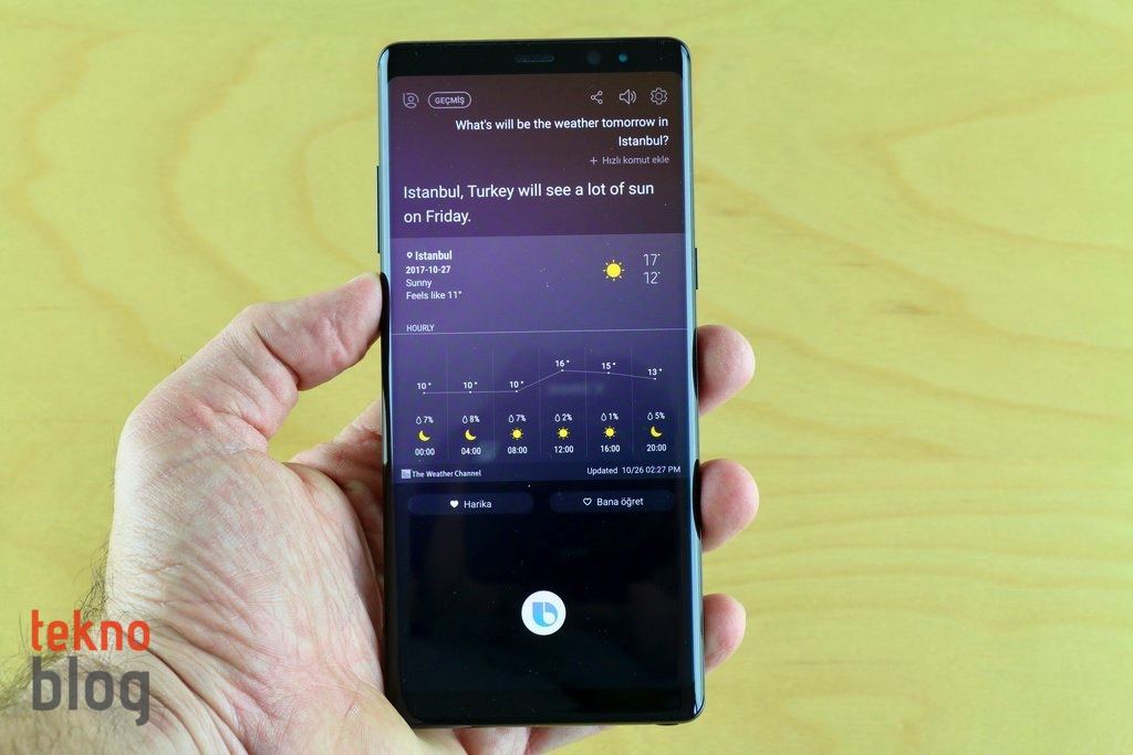 İlk kez Galaxy S8 ve S8+ ile tanıştığımız, ancak Türkçe desteğinin olmaması nedeniyle fazla kullanım alanı bulamadığımız Bixby, Note 8’de de mevcut. Aslına bakarsanız, sol kenardaki fiziksel Bixby tuşuyla da erişilebilen, en soldaki ana ekran panelini işgal eden, farklı uygulamaların içeriklerinin toplandığı Bixby Home, Türkiye’deki Note 8 kullanıcıları için de epey kullanışlı görünüyor. Ancak bu bölümü beğenmezseniz, fiziksel tuşla erişimi kapatma imkanını Samsung size sunuyor. Ne var ki, Bixby tuşuna başka bir işlev atamanıza şu an için müsade edilmiyor.