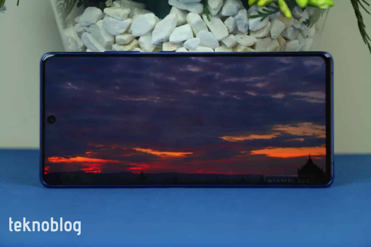 AMOLED teknolojisine sahip olduğu için sürekli açık ekran özelliğini de, pil ömrüne olumsuz etkide bulunmadan kullanabilirsiniz. Böylelikle telefon uyku durumundayken saat, tarih, bildirimler ve bunun gibi çeşitli bilgileri ve içerikleri ekranda görebilirsiniz. Ekranın üst kısmında bulunan selfie kamera deliği ise tam ekranda oyun veya film görüntülerken fazla rahatsızlık yaratmıyor.