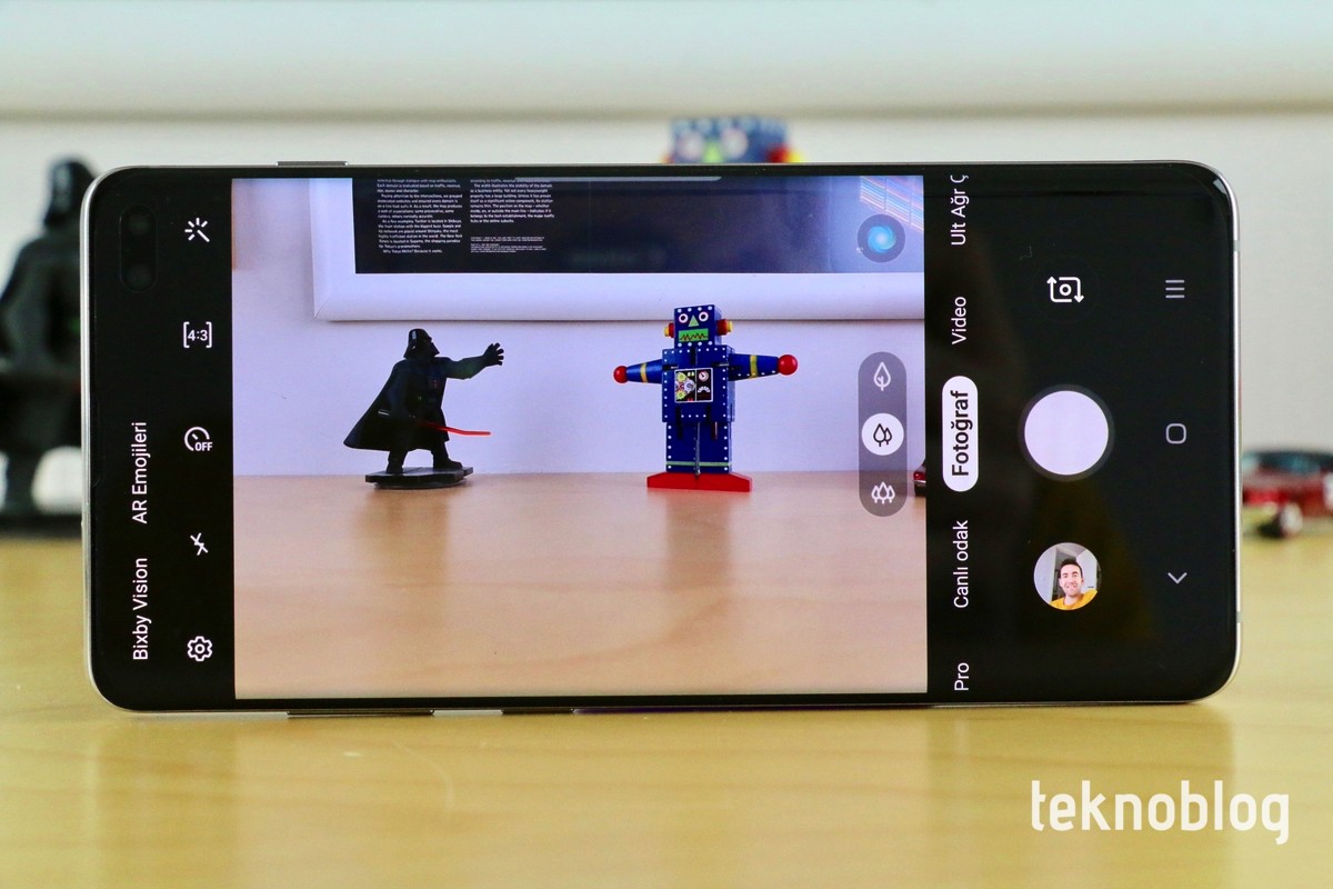 Galaxy S10+’ın Kamera uygulaması daha önce Galaxy S10e inceleme yazısı içinde bahsettiğimiz arayüz ile aynı. Samsung’un One UI kullanıcı arayüzü ile birlikte getirdiği bu kullanıcı arayüzü parmak uçlarıyla dost bir tasarıma sahip. Özellikle üç kamera arasında geçiş gayet pratik biçimde gerçekleştiriliyor. Ekranın bir tarafında her zaman elinizin altında olmasını isteyeceğiniz ayarlar var. Diğer tarafta da çekim modları, çekim tuşu, kamera değiştirme ve galeriye kısayol sıralanmış. Pro modunda DSLR makinelerden bildiğimiz ayarlar mevcutken RAW formatında kayıt imkanı da sunuluyor. Öte yandan daha önceki amiral gemisi Samsung telefonlarından bildiğimiz AR Emoji ve AR filtreleri yine mevcut.
